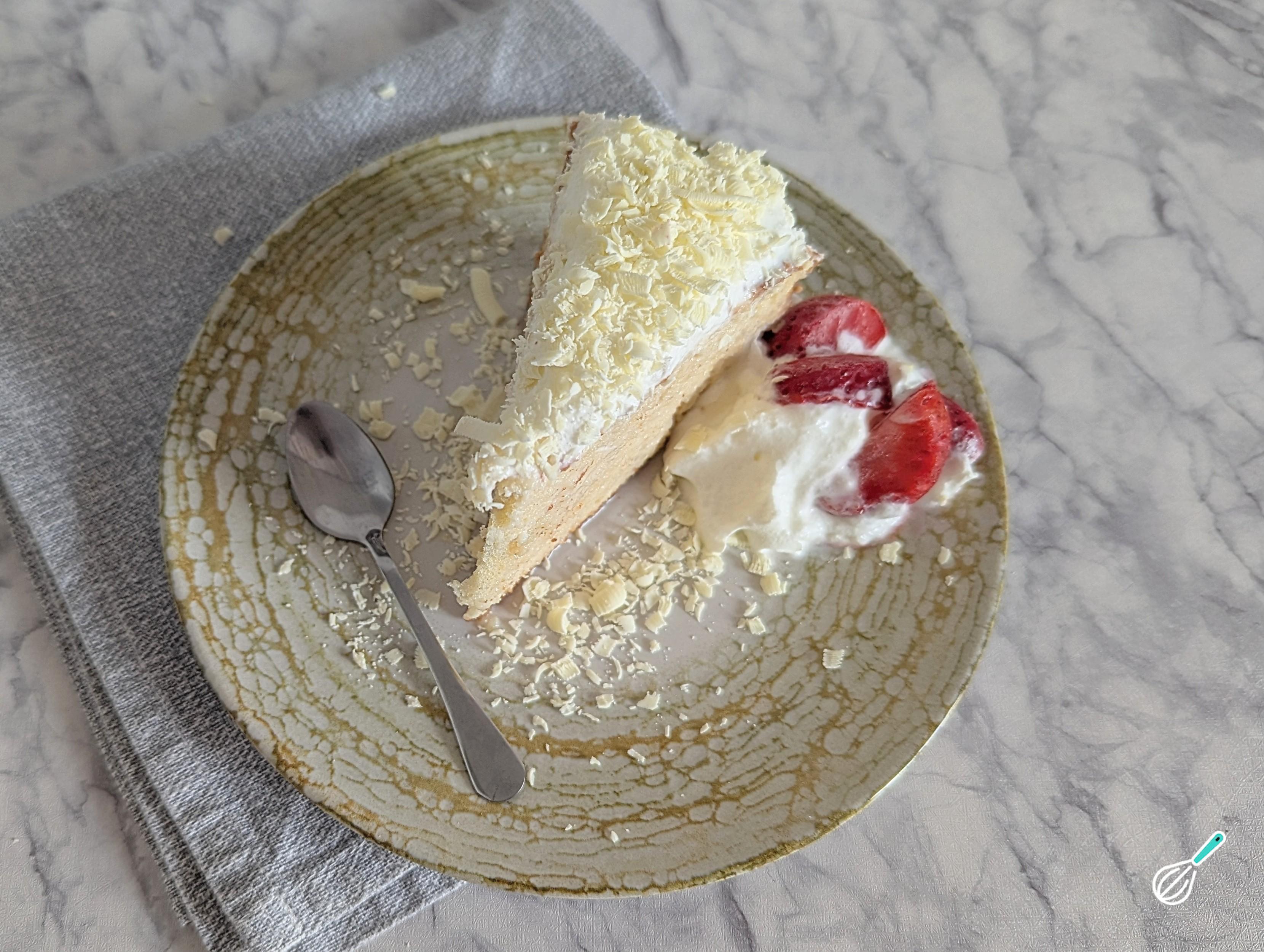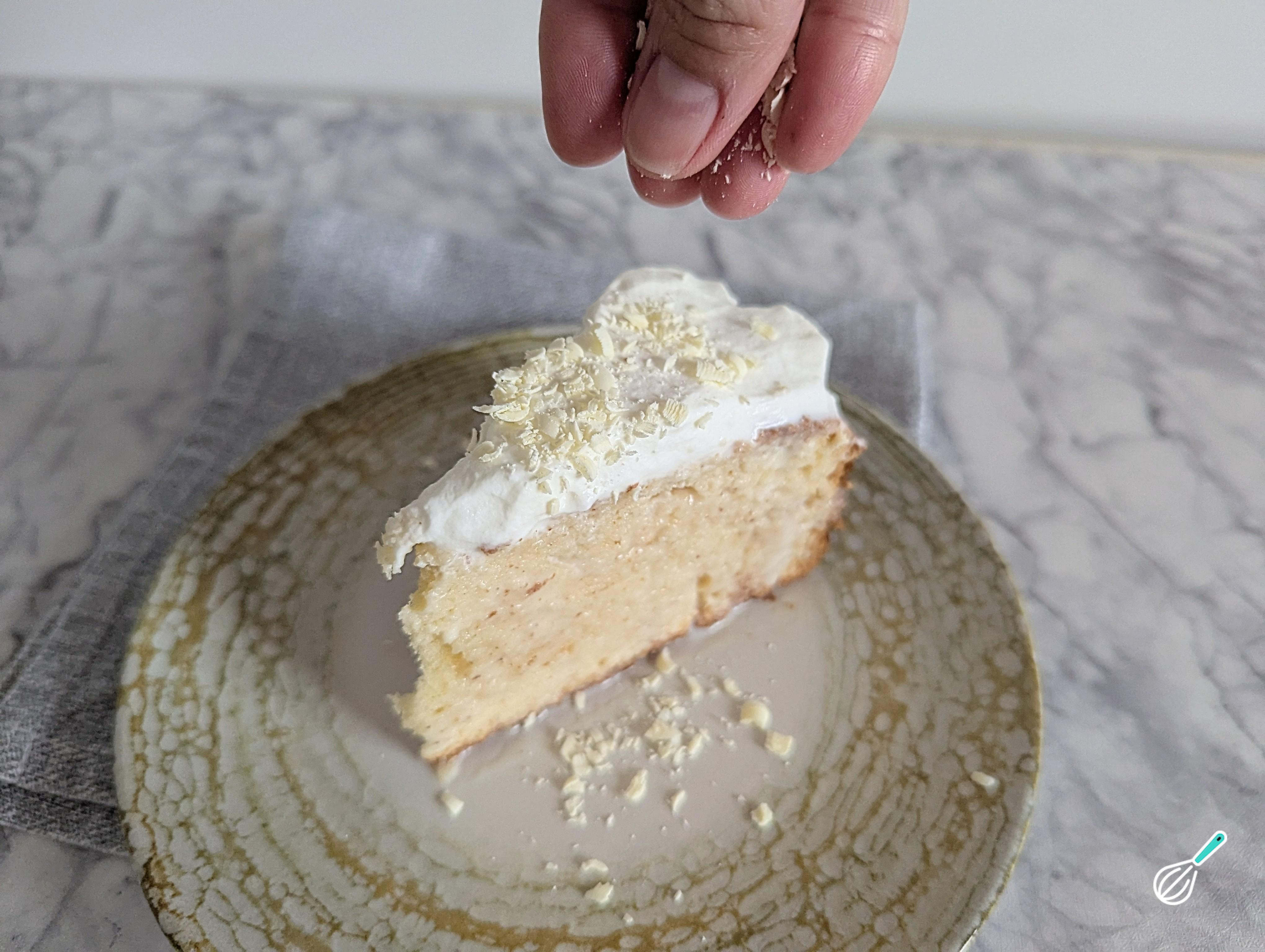 Retire o bolo da geladeira e se desejar, decore com chantilly batido ou já pronto. Coloque por cima, raspas de chocolate branco ou coco ralado, como preferir.