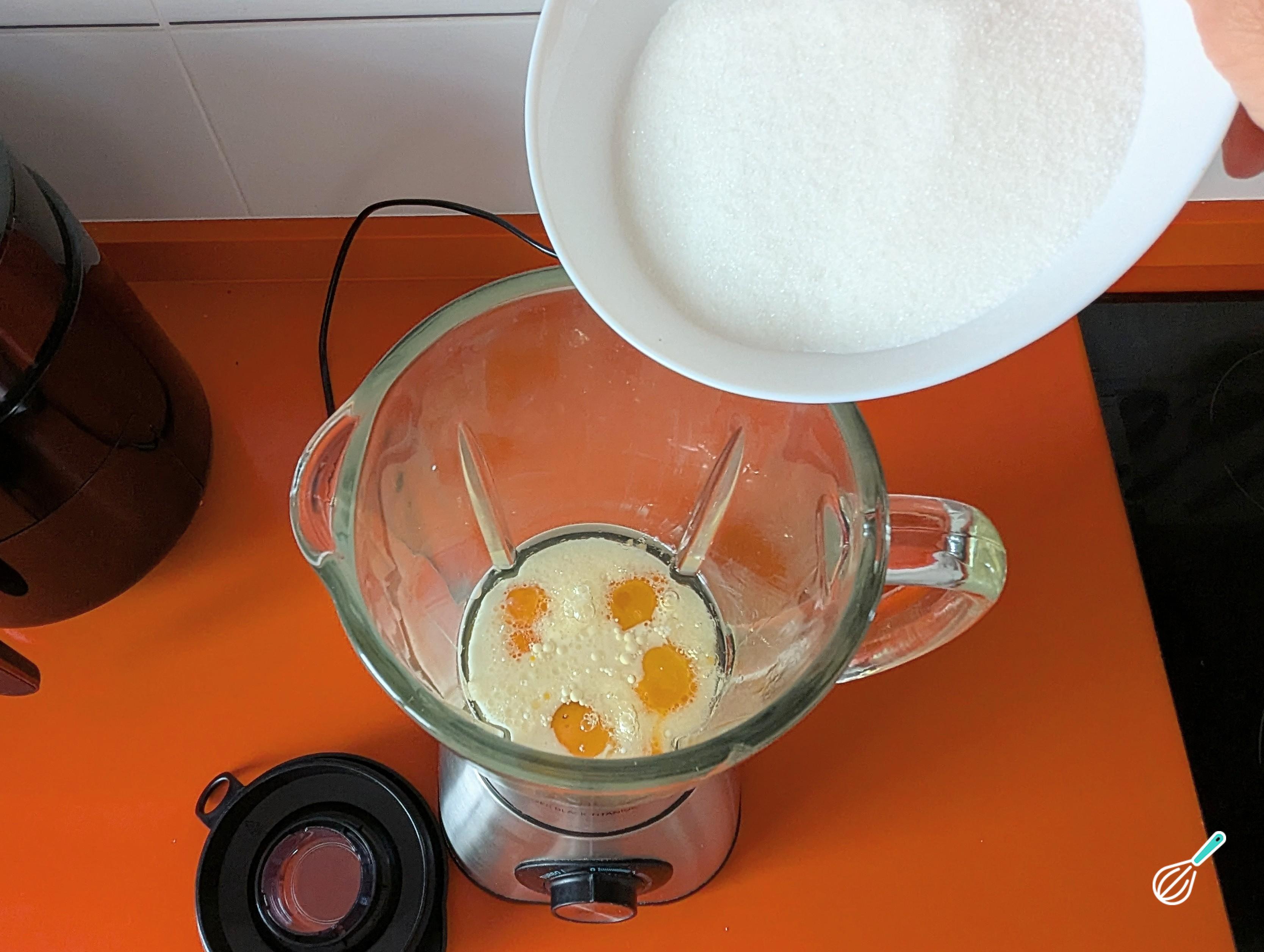 No liquidificador, adicione os ovos, o leite, o óleo e o açúcar. Bata por aproximadamente 2 minutos, até formar uma mistura homogênea.