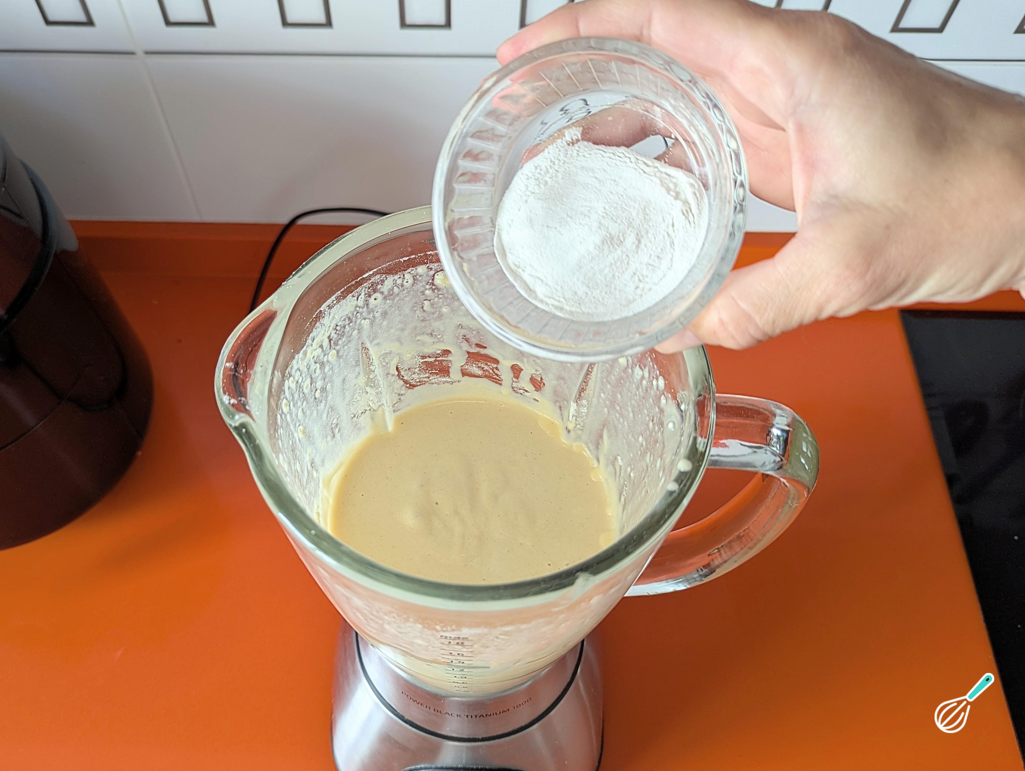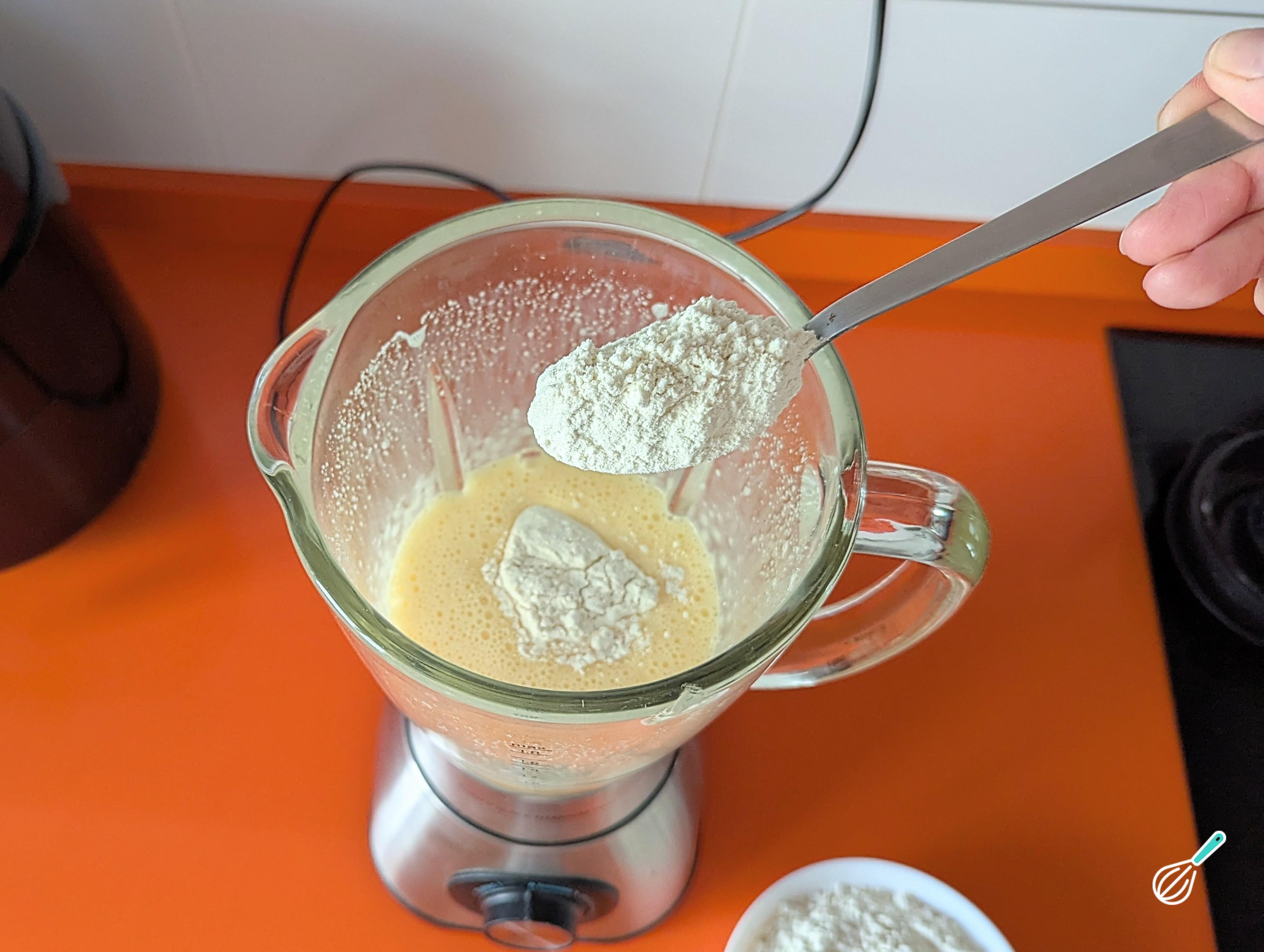 Acrescente a farinha de trigo aos poucos, batendo em velocidade baixa para evitar que a massa fique muito pesada. Se necessário, desligue o liquidificador e misture com uma colher para ajudar.