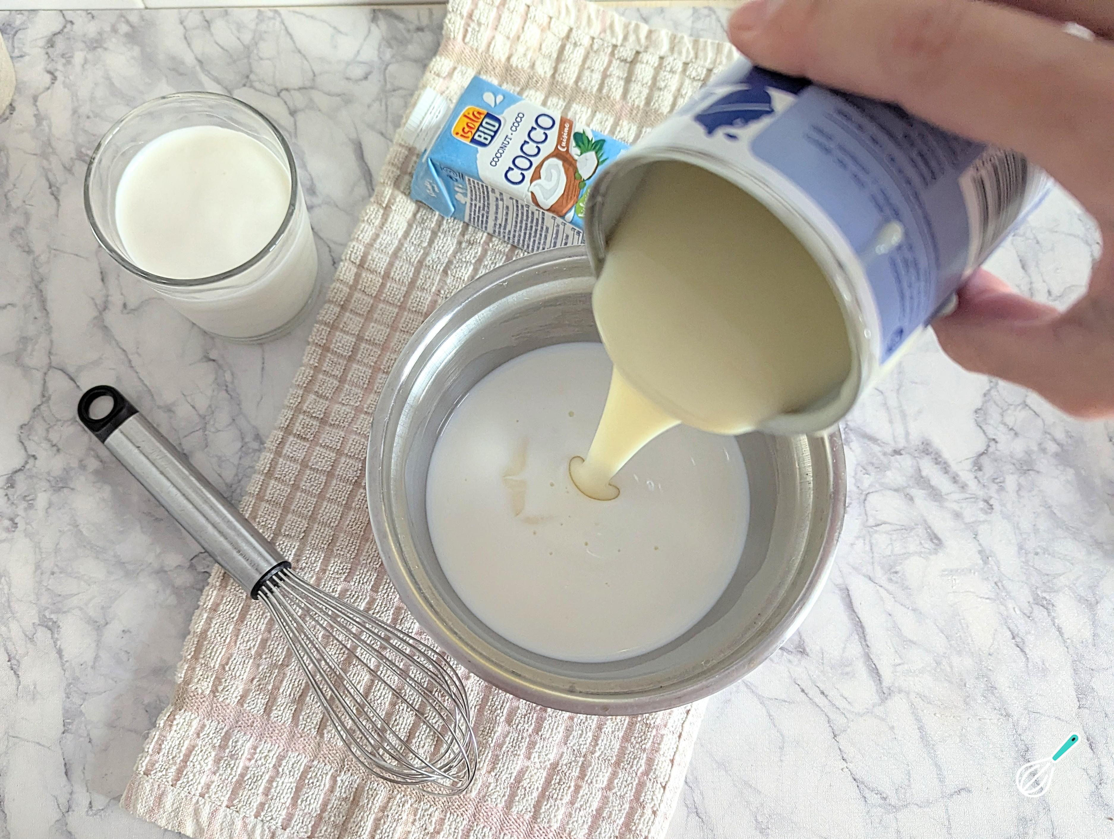 Prepare agora a calda de 4 leites. Em uma tigela, misture o leite integral, o leite condensado, o creme de leite e o leite de coco. Mexa bem com um fouet ou colher até que a calda fique uniforme.