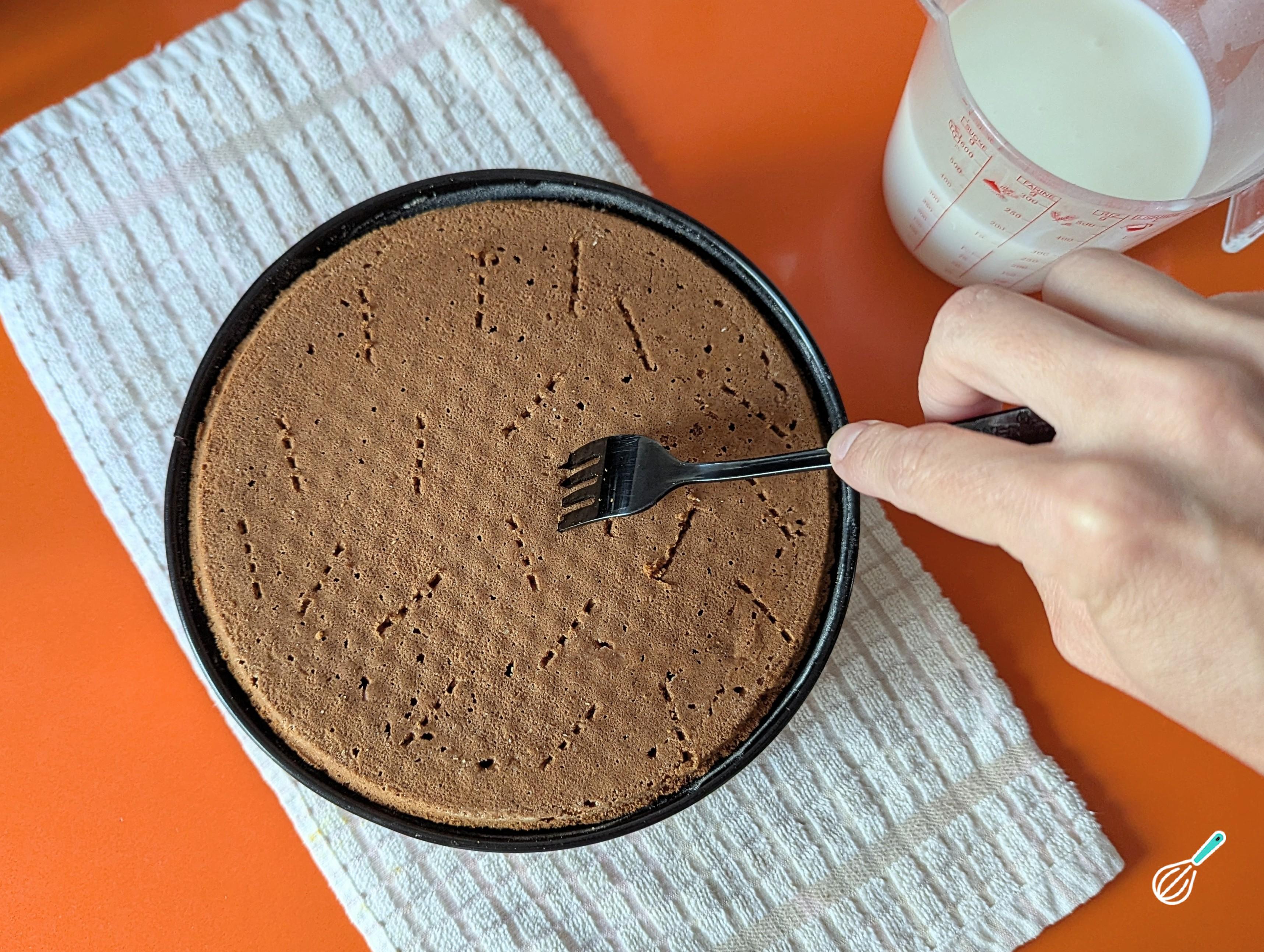 Após retirar o bolo do forno, espere amornar. Nivele o bolo se for necessário ou coloque a parte reta do fundo para cima. Faça furos em toda superfície do bolo usando um palito ou um garfo.