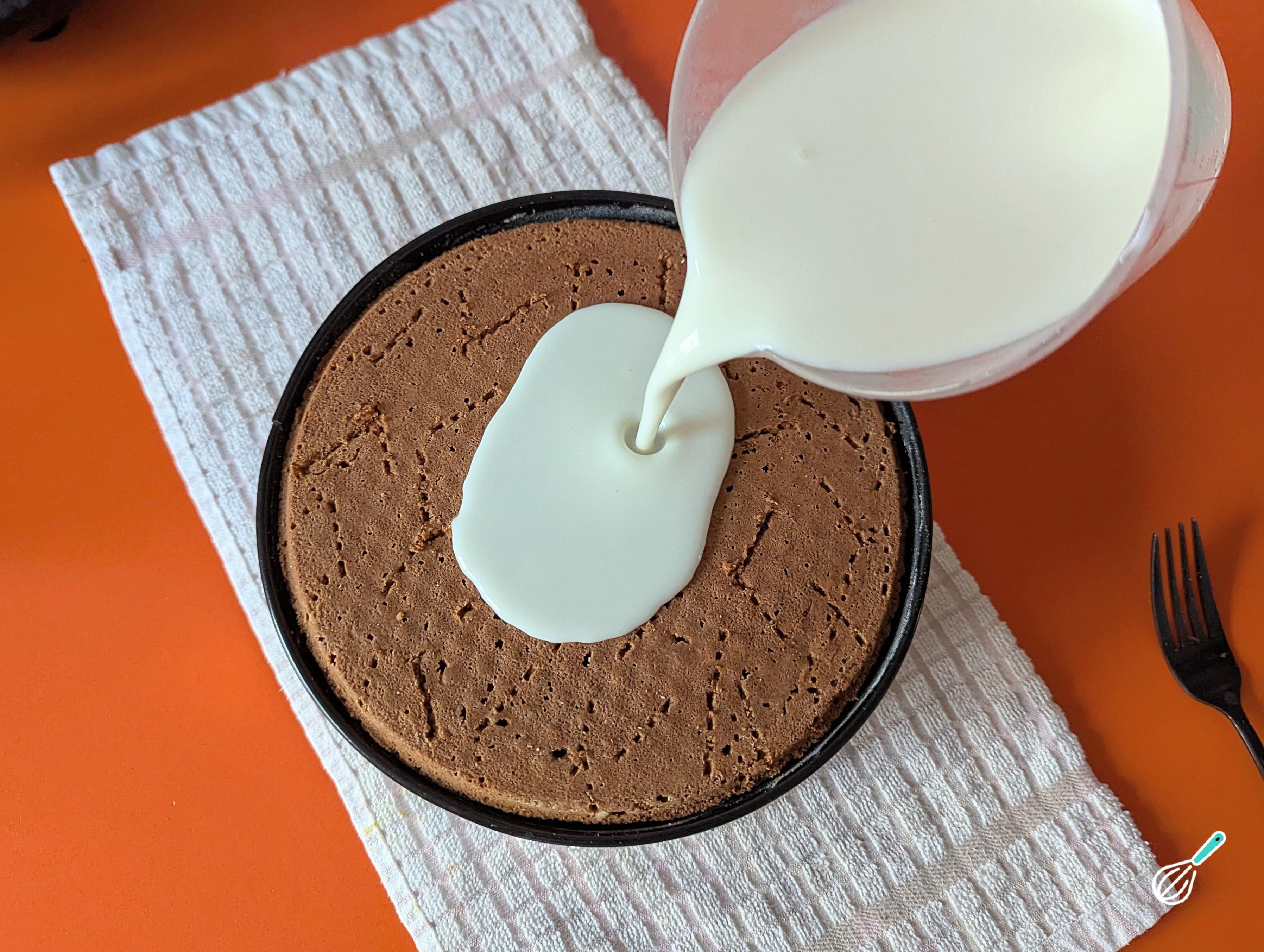 Despeje a calda de 4 leites sobre o bolo, espalhando bem para que a calda seja absorvida e o bolo fique bem molhadinho.
