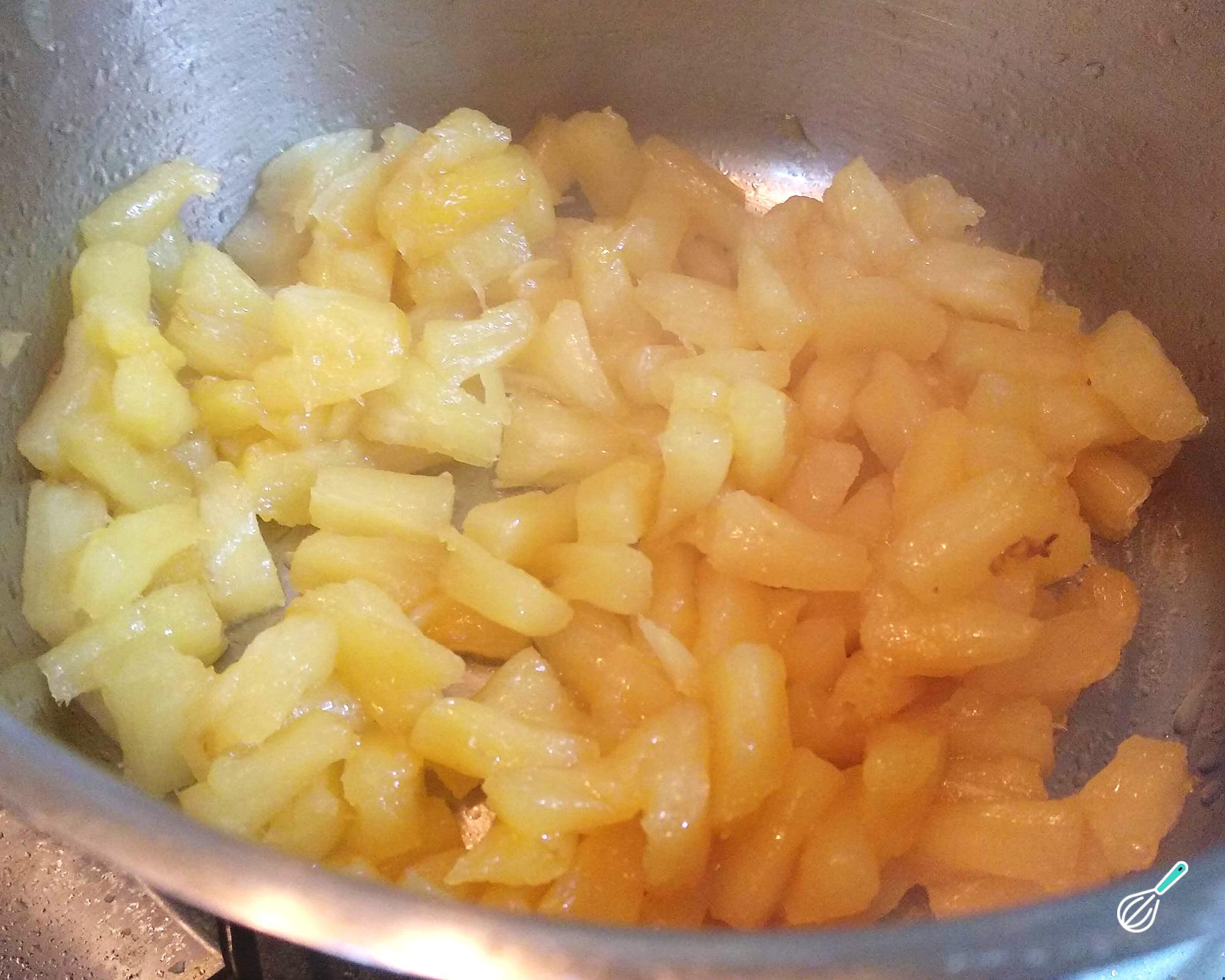 Comece preparando a calda de abacaxi: leve ao fogo uma panela com o abacaxi, a manteiga e o adoçante e deixe ferver por 1 minuto. Desligue o fogo e, com cuidado, junte o creme de leite. Misture e reserve.