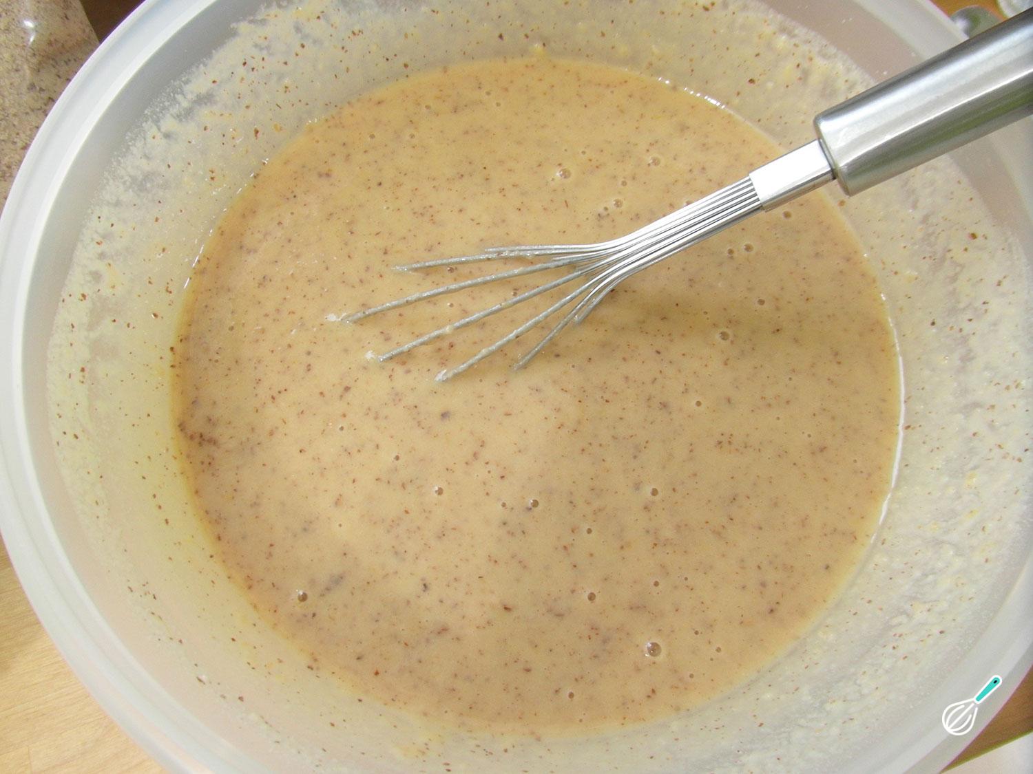 Numa tigela misture a farinha de amêndoas com a whey protein e adicione metade desses secos na mistura anterior. Bata até incorporar bem, coloque o leite, misture, coloque o restante dos secos (incluindo o fermento) e volte a misturar até obter uma massa de bolo lisinha.
