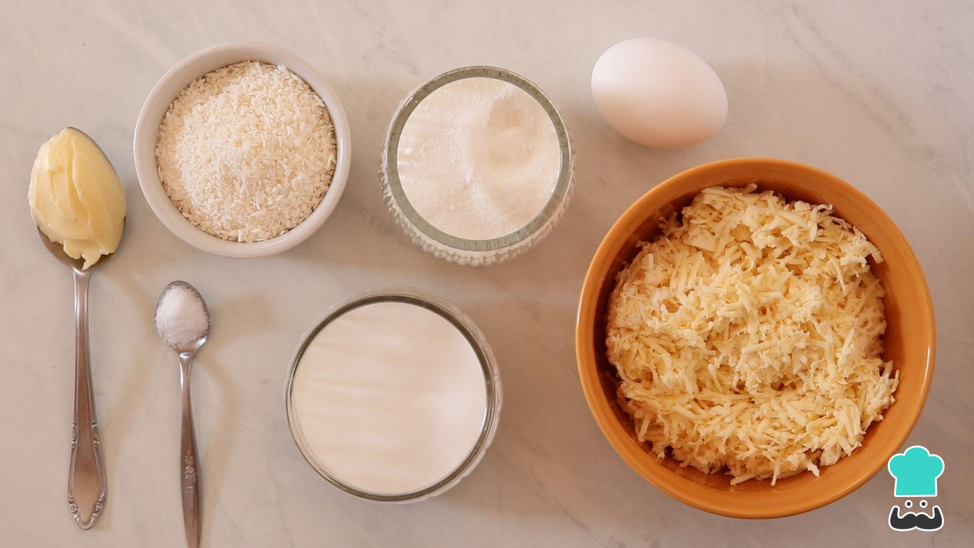 Separe os ingredientes. Rale a mandioca e deixe a manteiga crua descascada e o ovo em temperatura ambiente.