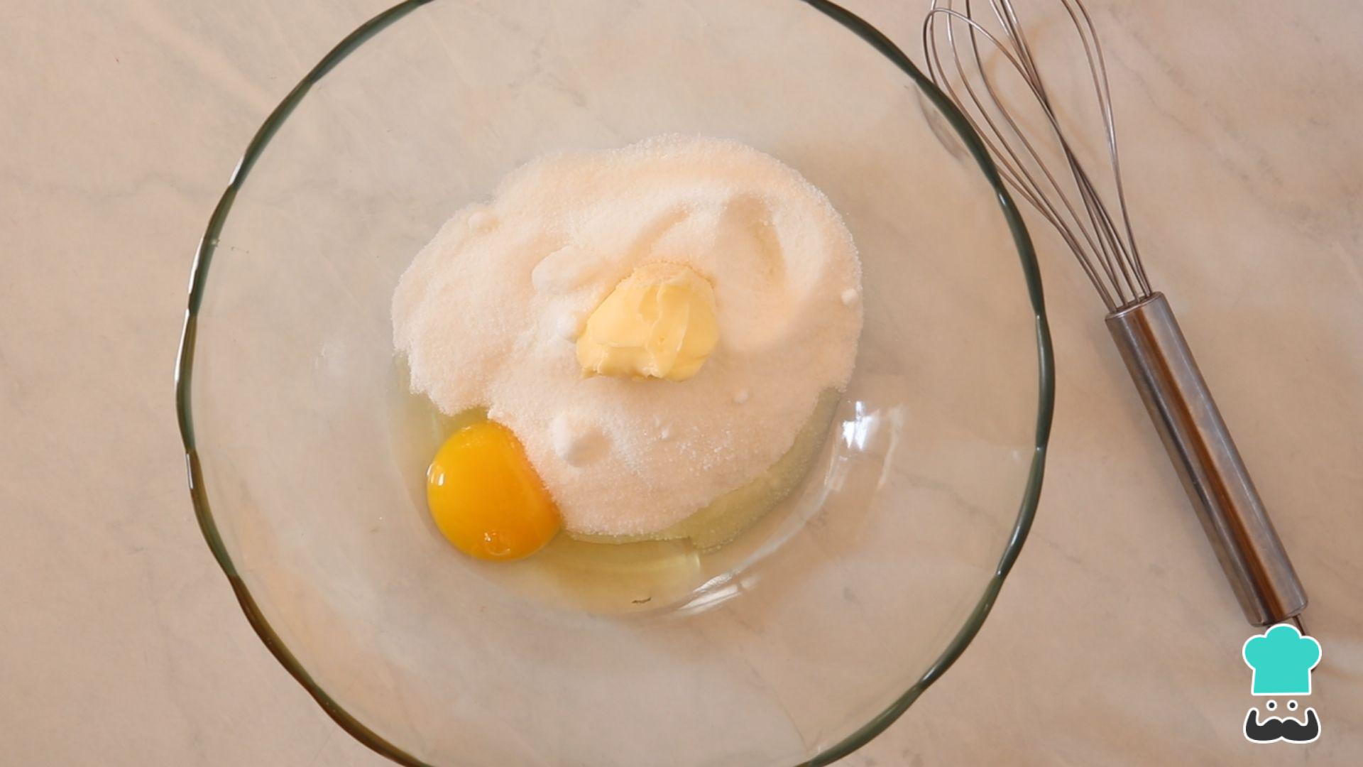 Coloque o ovo, o açúcar e a manteiga em uma tigela.