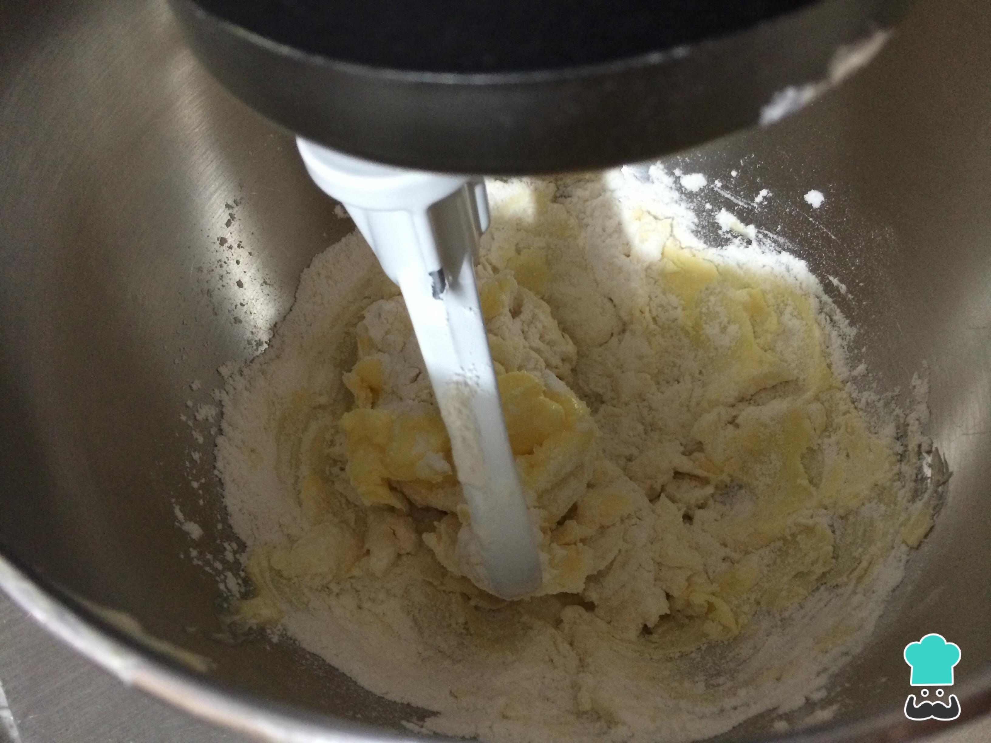 Com a ajuda de uma batedeira, bata a manteiga com a farinha e o adoçante. O resultado deverá ser uma massa homogênea.