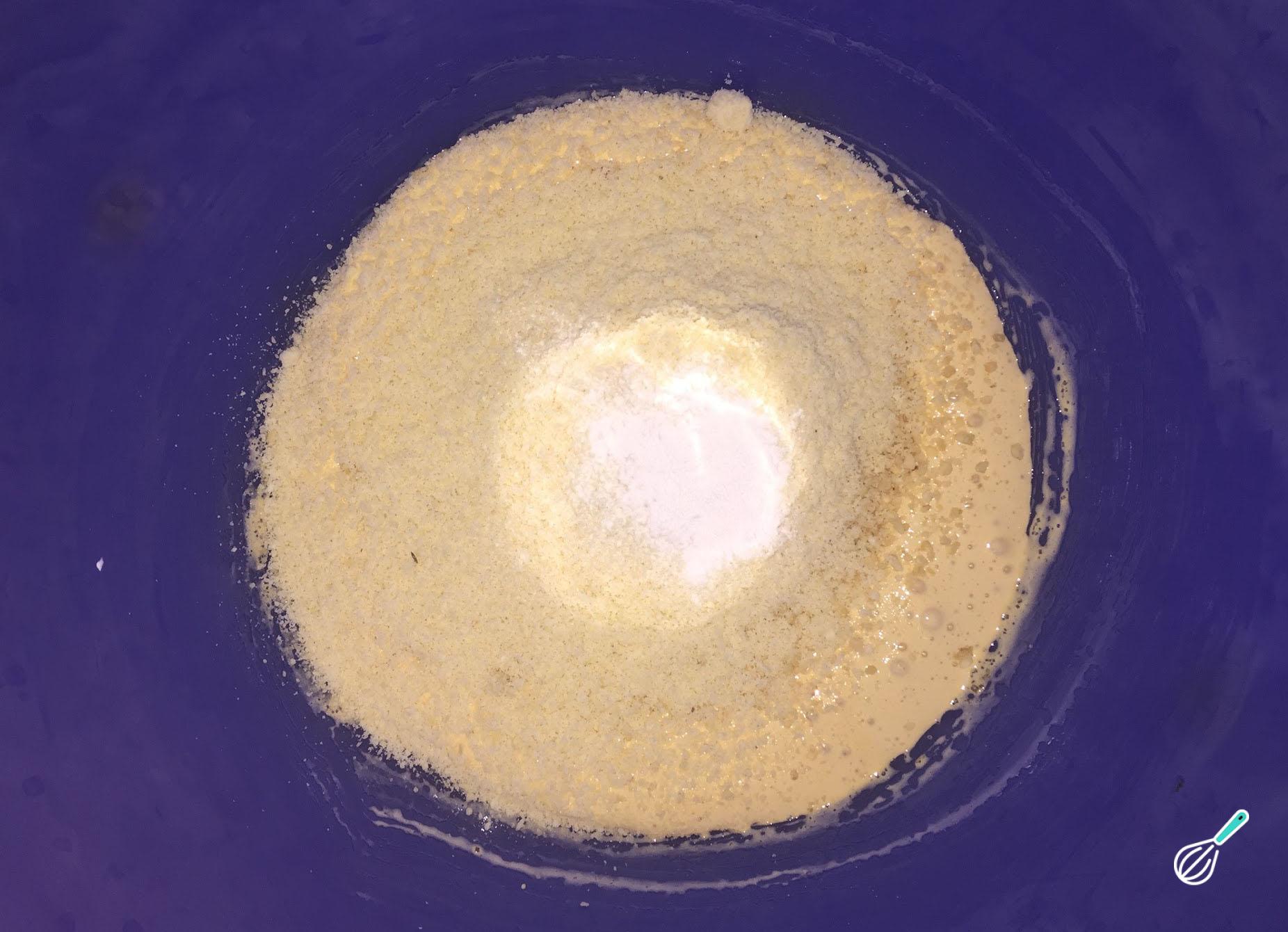 Junte a farinha de amêndoas, a farinha de avelã, o fermento em pó e mexa bem.