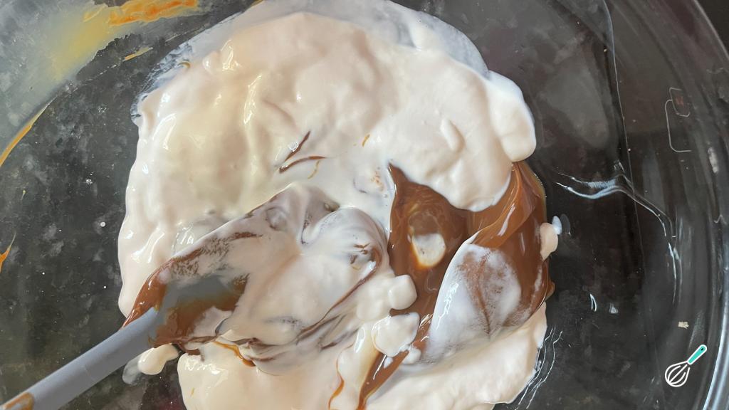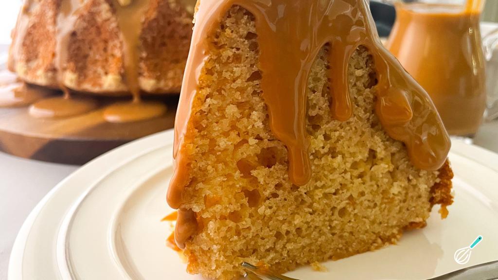 Após o bolo esfriar e ser desenformado, misture o doce de leite com o creme de leite e despeje no bolo – reserve um pouco da calda para servir junto com as fatias.
