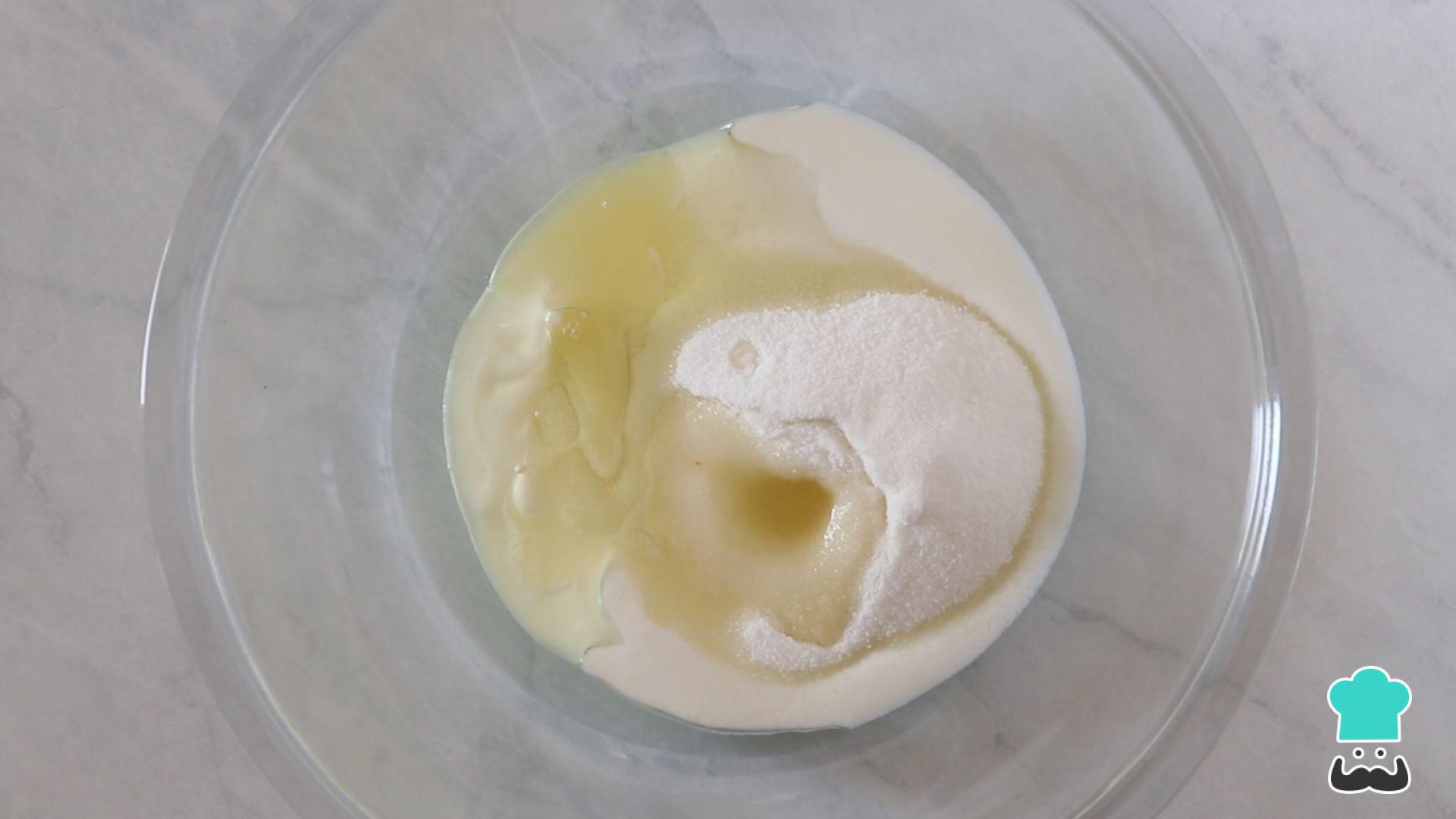 Bata na batedeira o iogurte, o açúcar, o óleo e o suco de limão até incorporar bem os ingredientes.