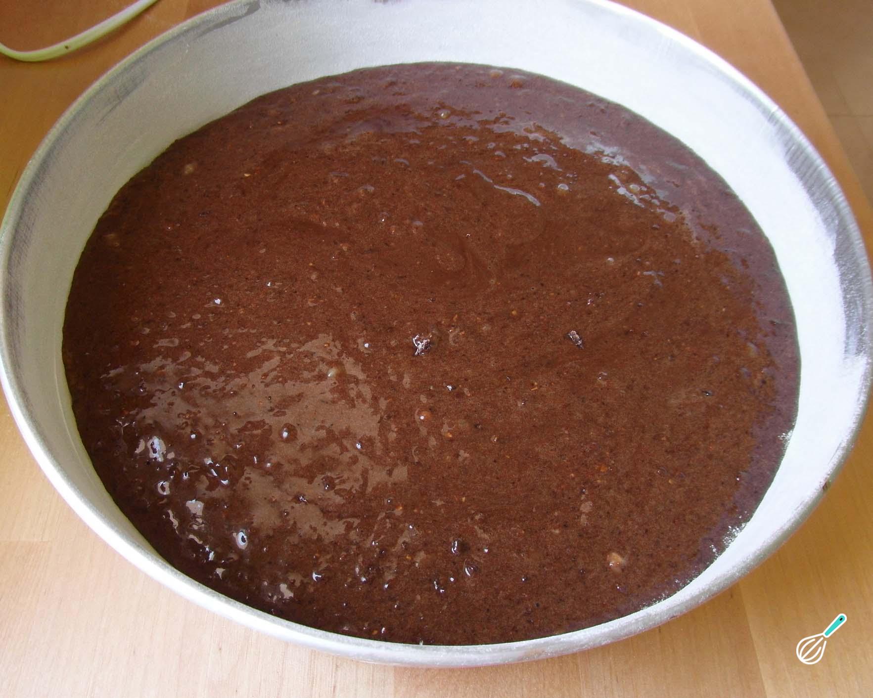 Dissolva o chocolate ou cacau na água. Adicione a água com chocolate e a farinha peneirada à mistura anterior, alternadamente, enquanto mexe. Quando tudo estiver bem incorporado e não restarem grumos, adicione o sal e o fermento e misture ligeiramente.