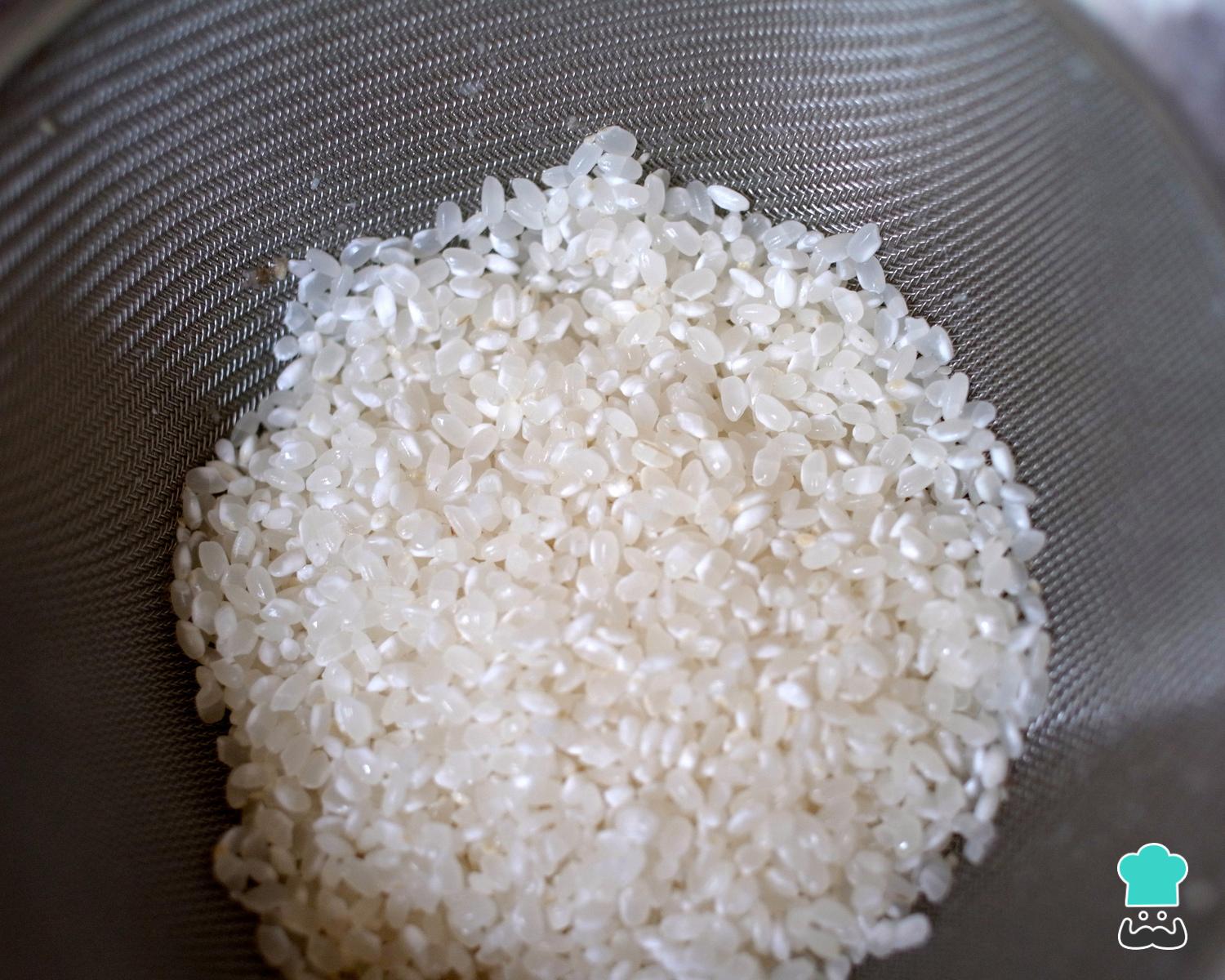 Antes de tudo coloque o arroz de molho em água filtrada por 3 horas, para ficar macio. Depois desse tempo escorra a água, enxague o arroz e coloque-o no liquidificador.