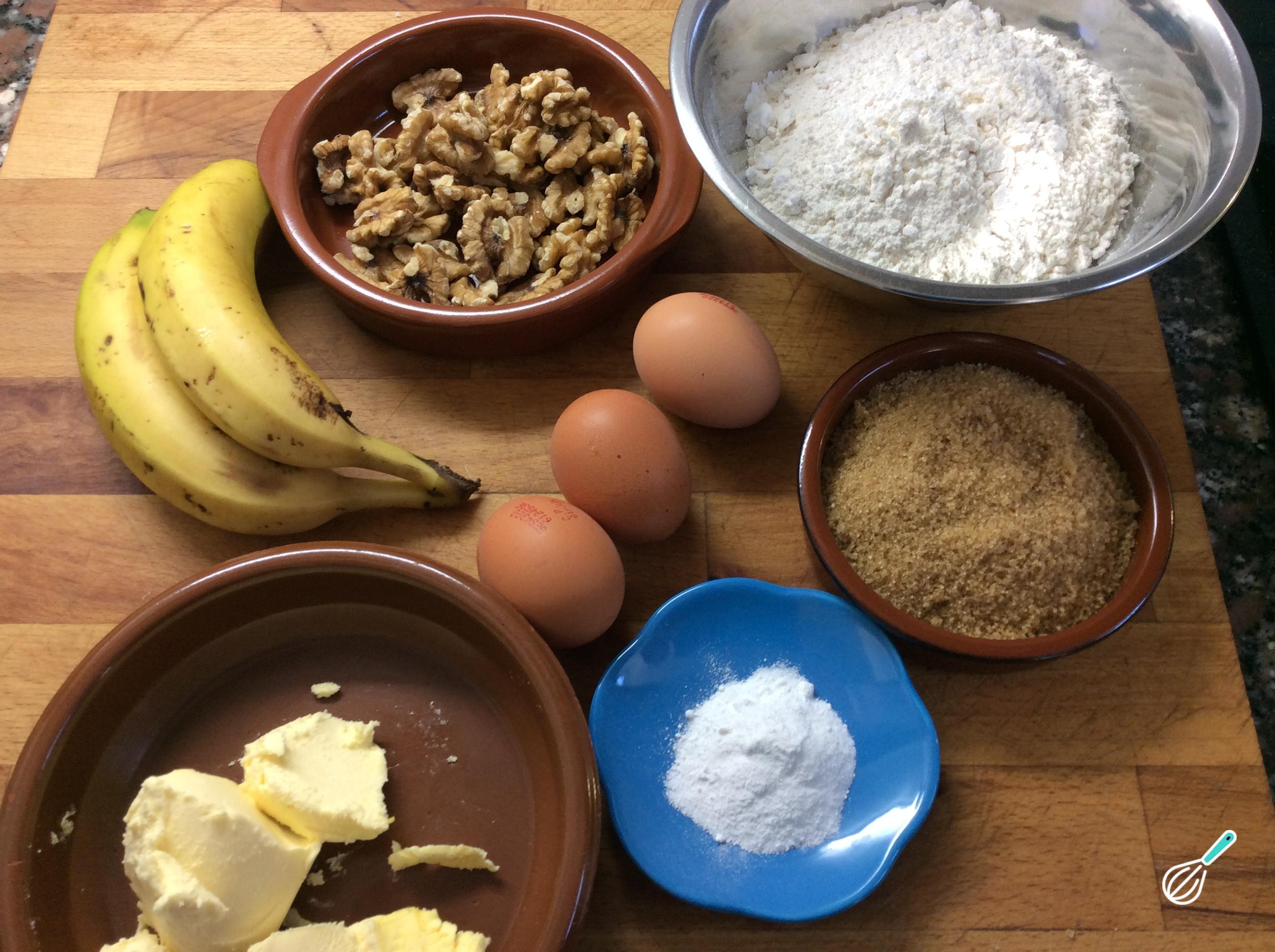 Comece por reunir os ingredientes os ingredientes deste bolo com banana e nozes, assim será mais rápido e fácil.