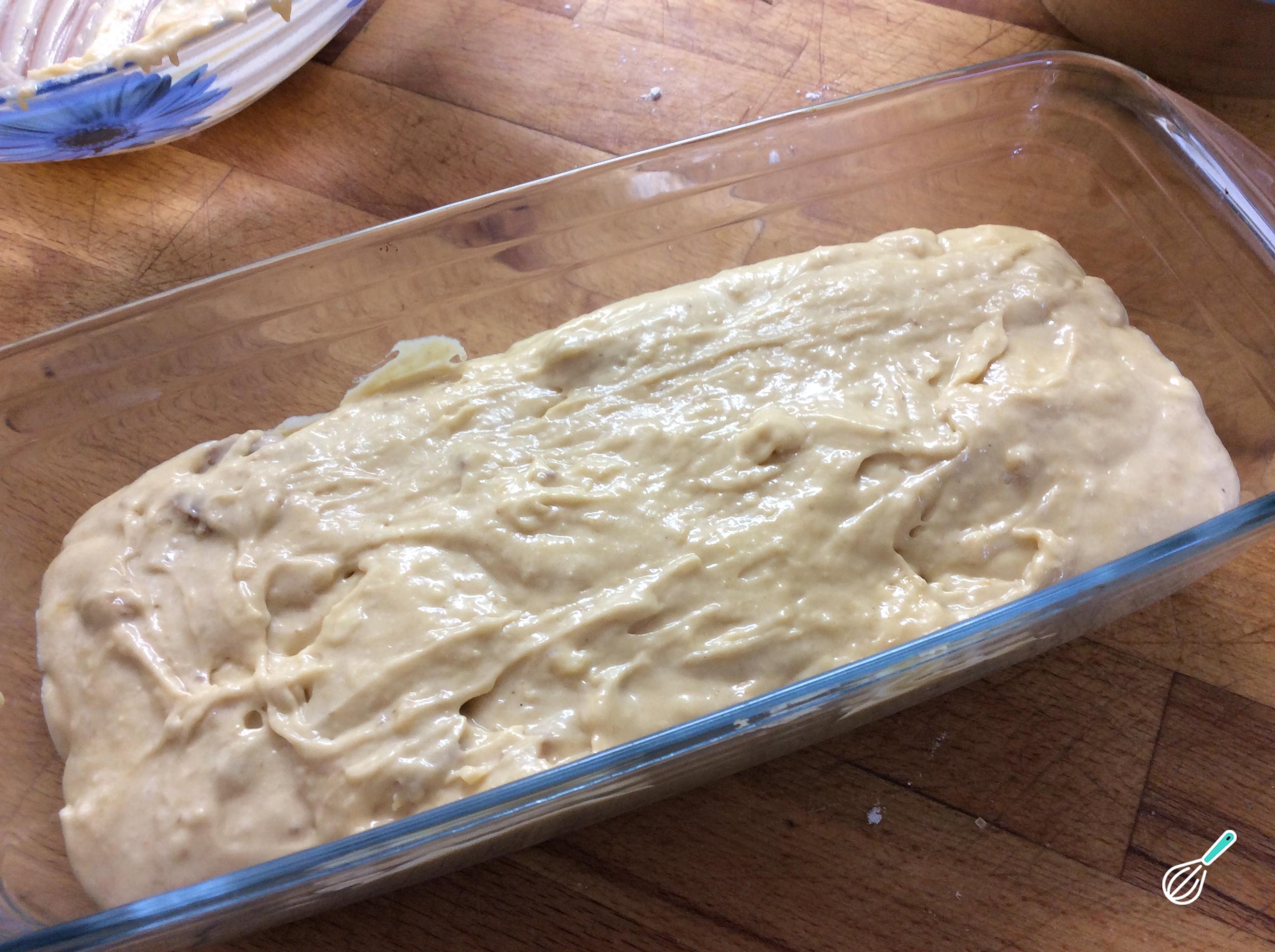 Em seguida adicione a manteiga amolecida, a banana cortada em pedaços ou amassada e volte a misturar. Depois acrescente as nozes picadas e a farinha e misture bem, por fim junte o fermento. O resultado será uma massa de bolo de banana caseiro um pouco espessa.