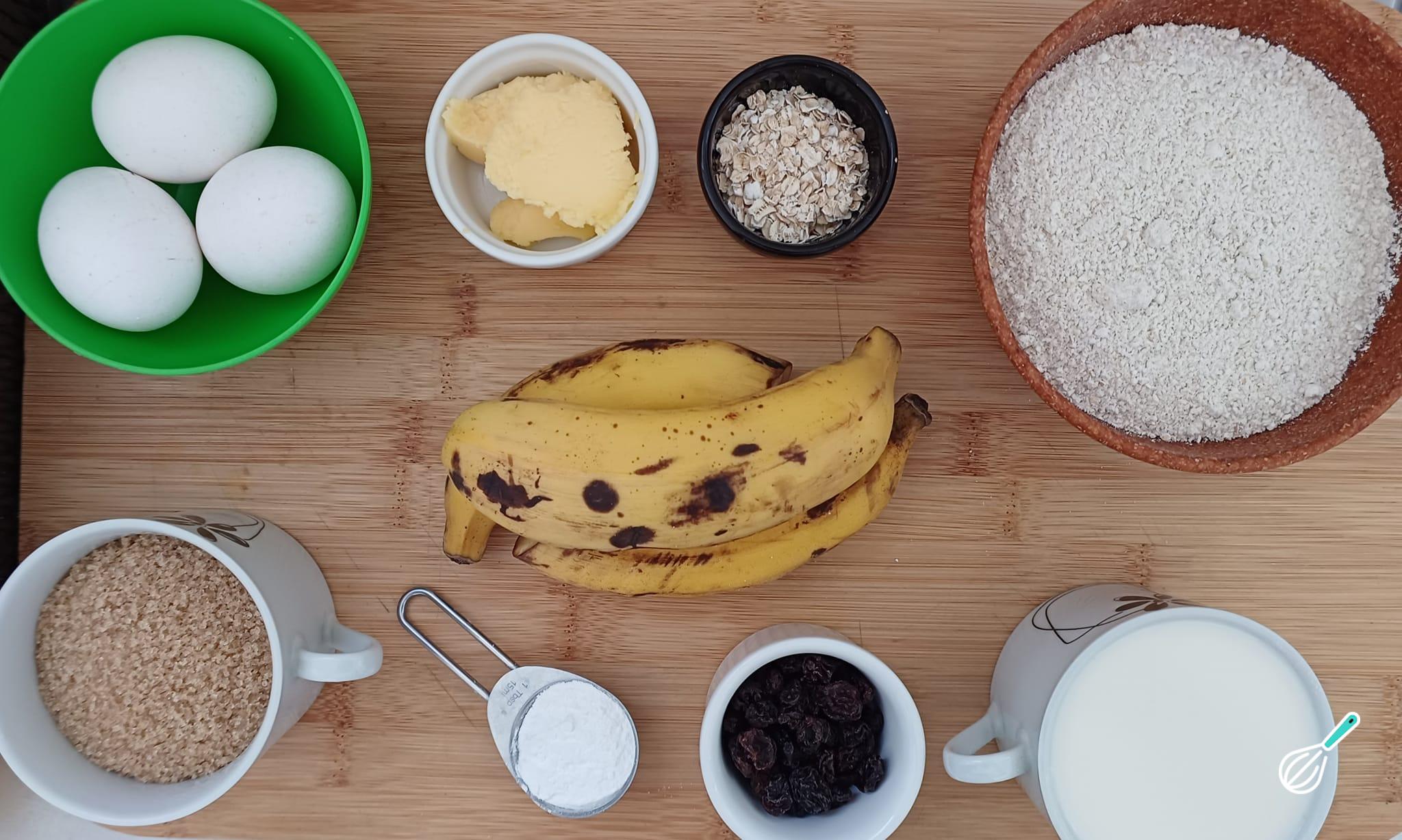 Separe todos os ingredientes necessários para preparar o bolo de banana com aveia no liquidificador.