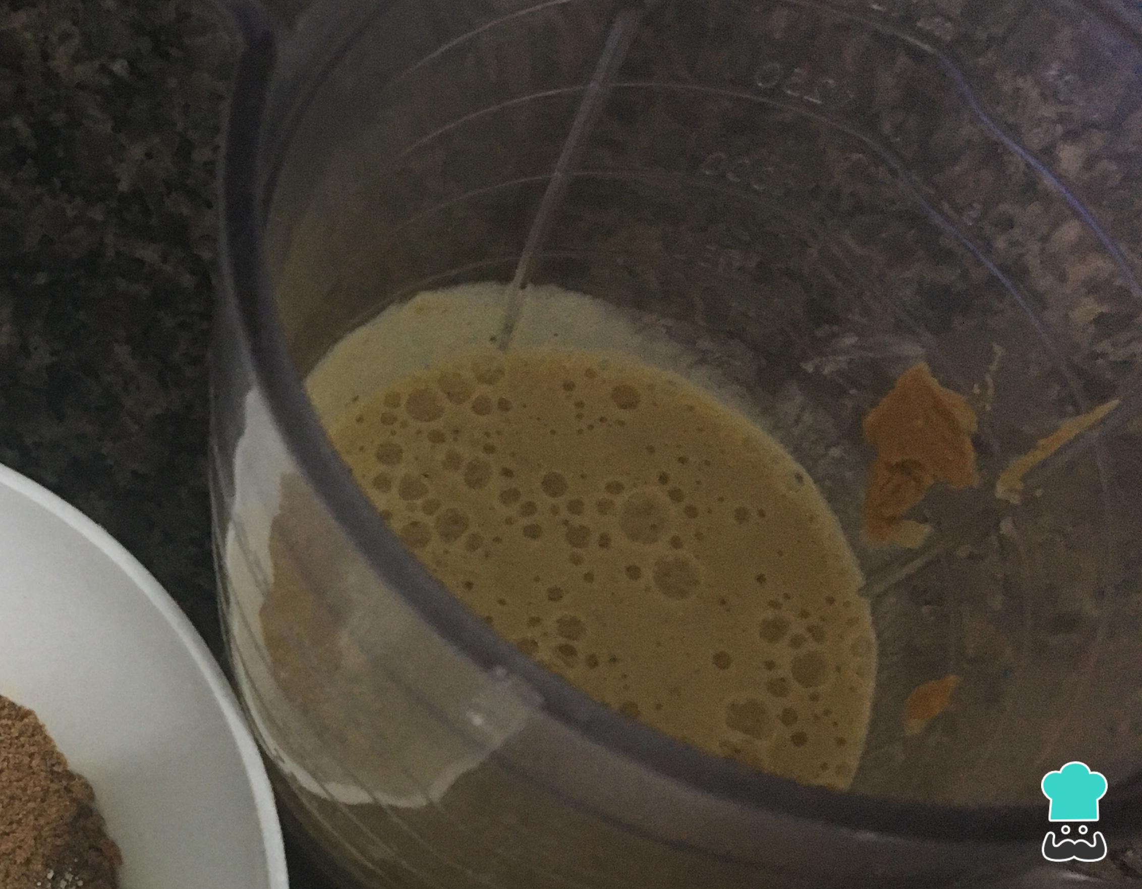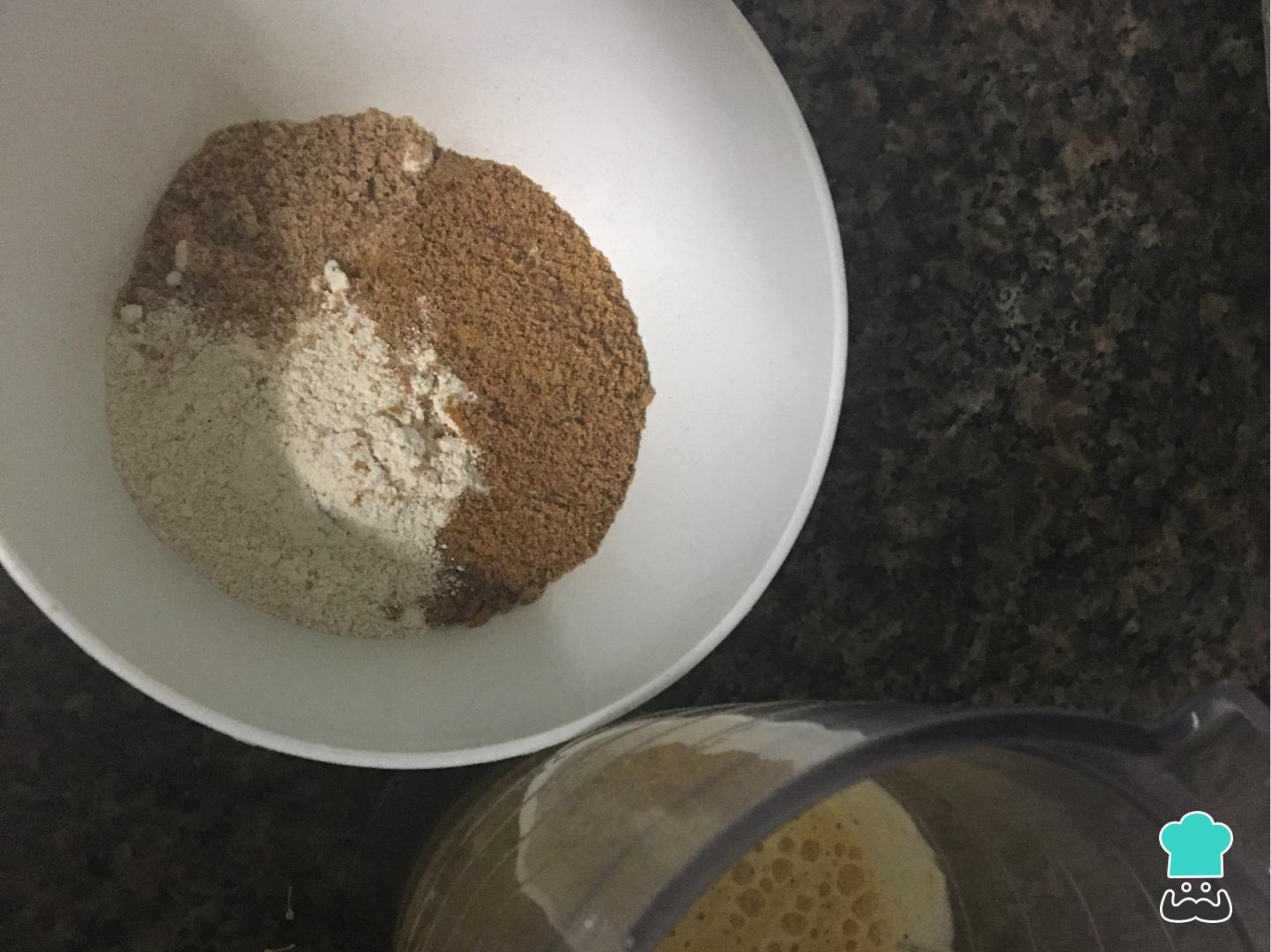 E em um recipiente junte a farinha, o açúcar de coco, a farinha de coco. Junte a mistura do liquidificador e mexa até incorporar.