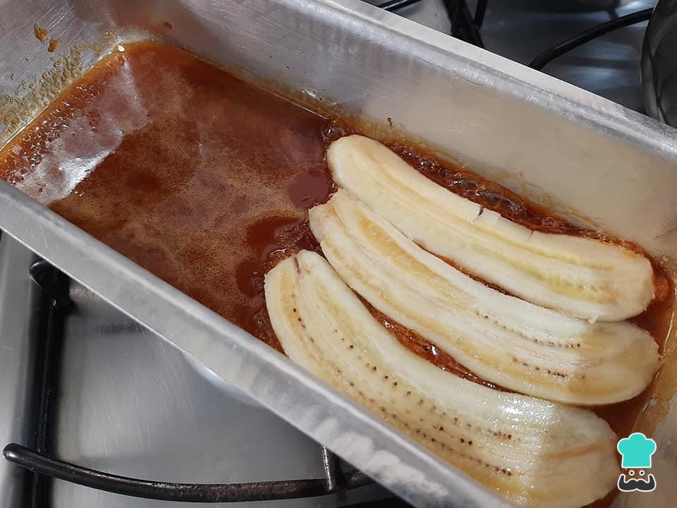 Dica: Não deixe o caramelo esfriar para acomodar as bananas, assim garantirá que estas fiquem bem aderidas ao caramelo.