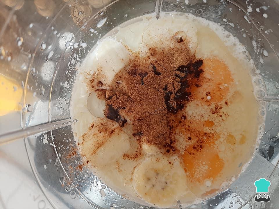 No liquidificador bata o açúcar, a banana picada, os ovos, o leite morno, a canela em pó e o óleo até ficar bem homogêneo.