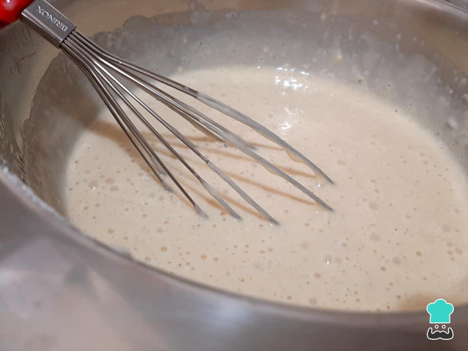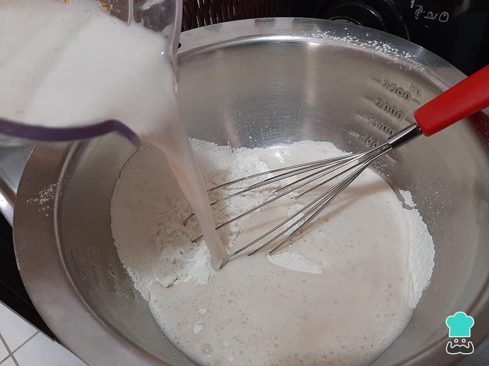 Numa tigela despeje esse líquido aos poucos sobre a farinha de trigo peneirada, misturando bem até que a massa esteja lisa e homogênea.