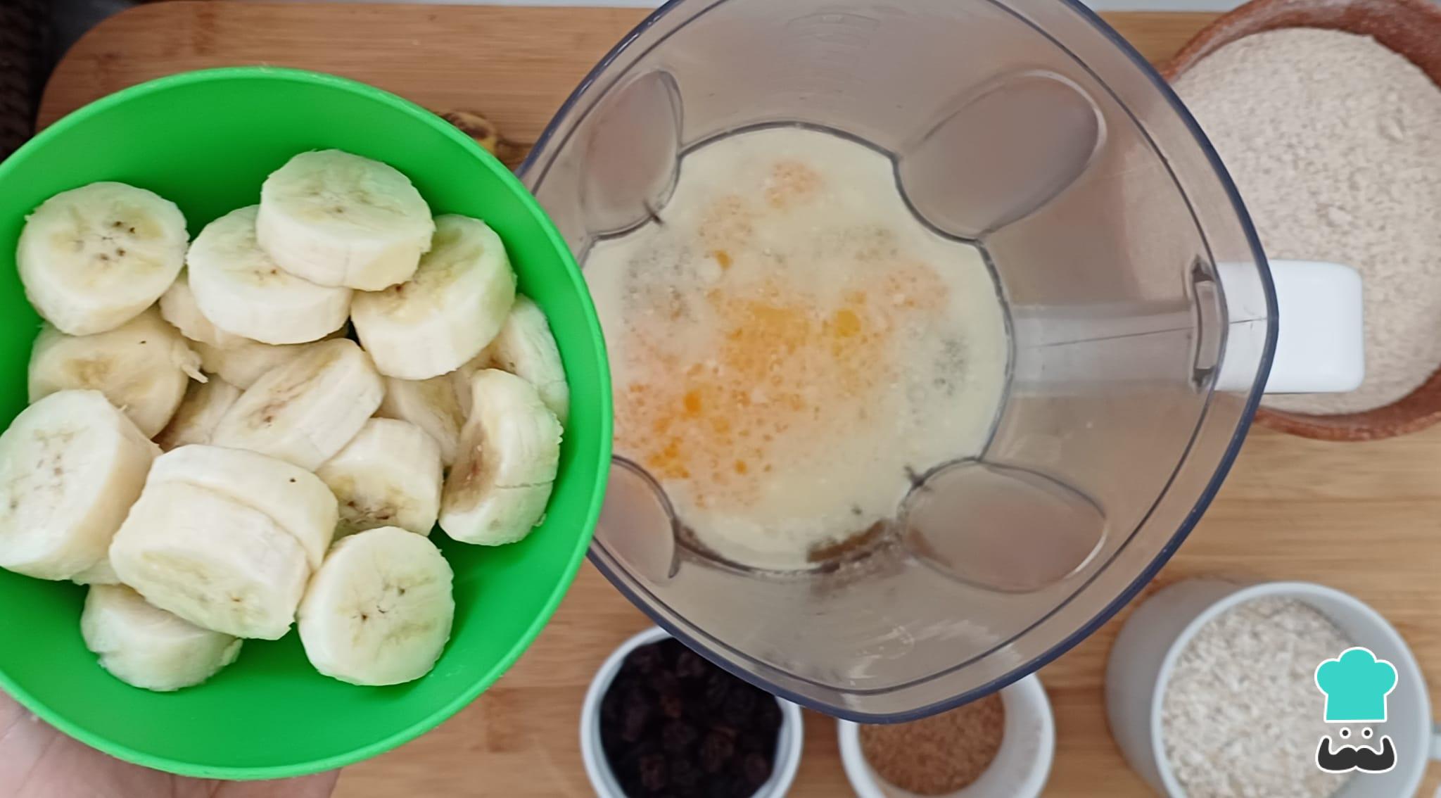 No liquidificador, coloque o leite, os ovos, o óleo, o açúcar e 2 bananas picadas, batendo até ficar homogêneo.