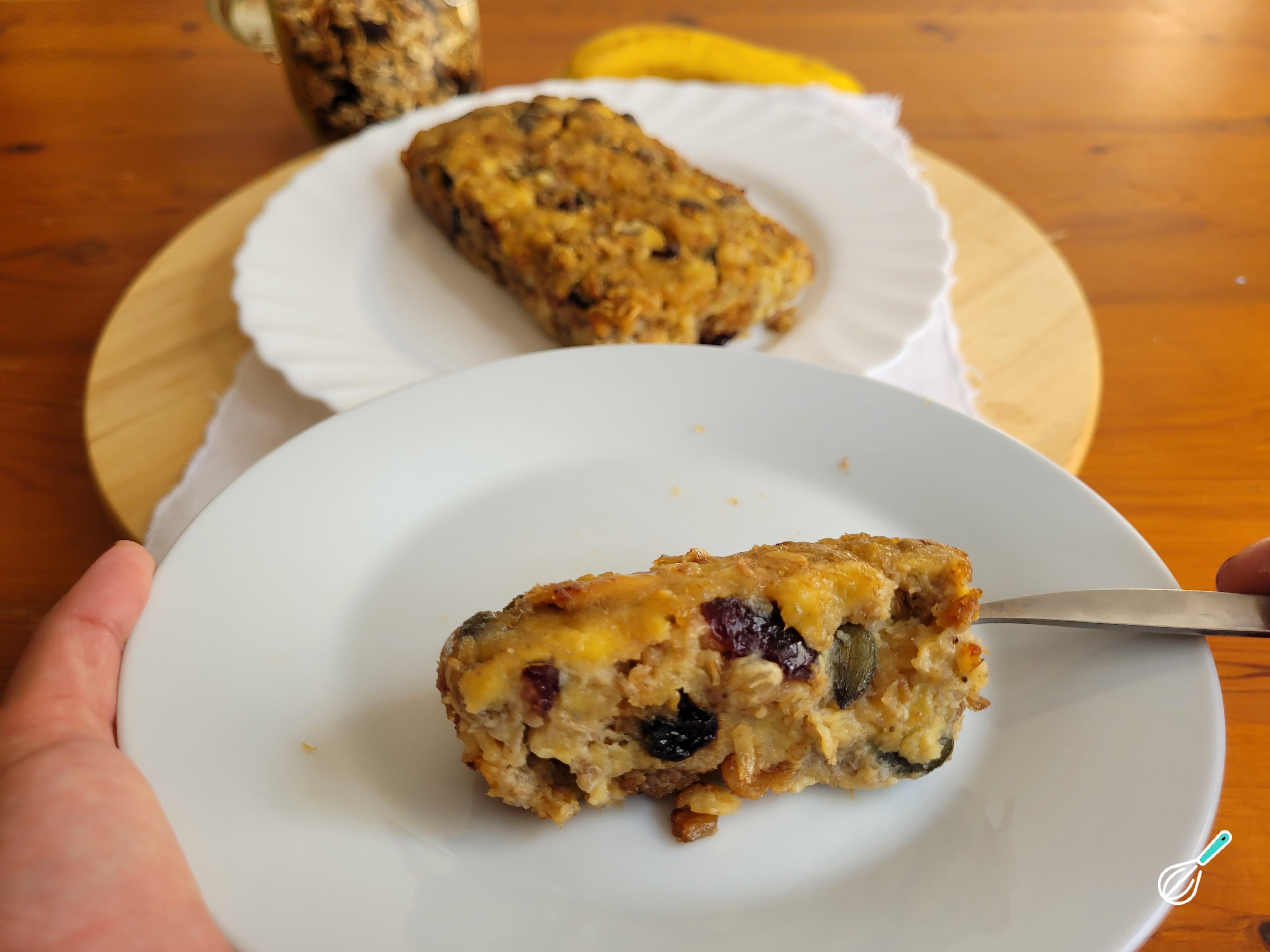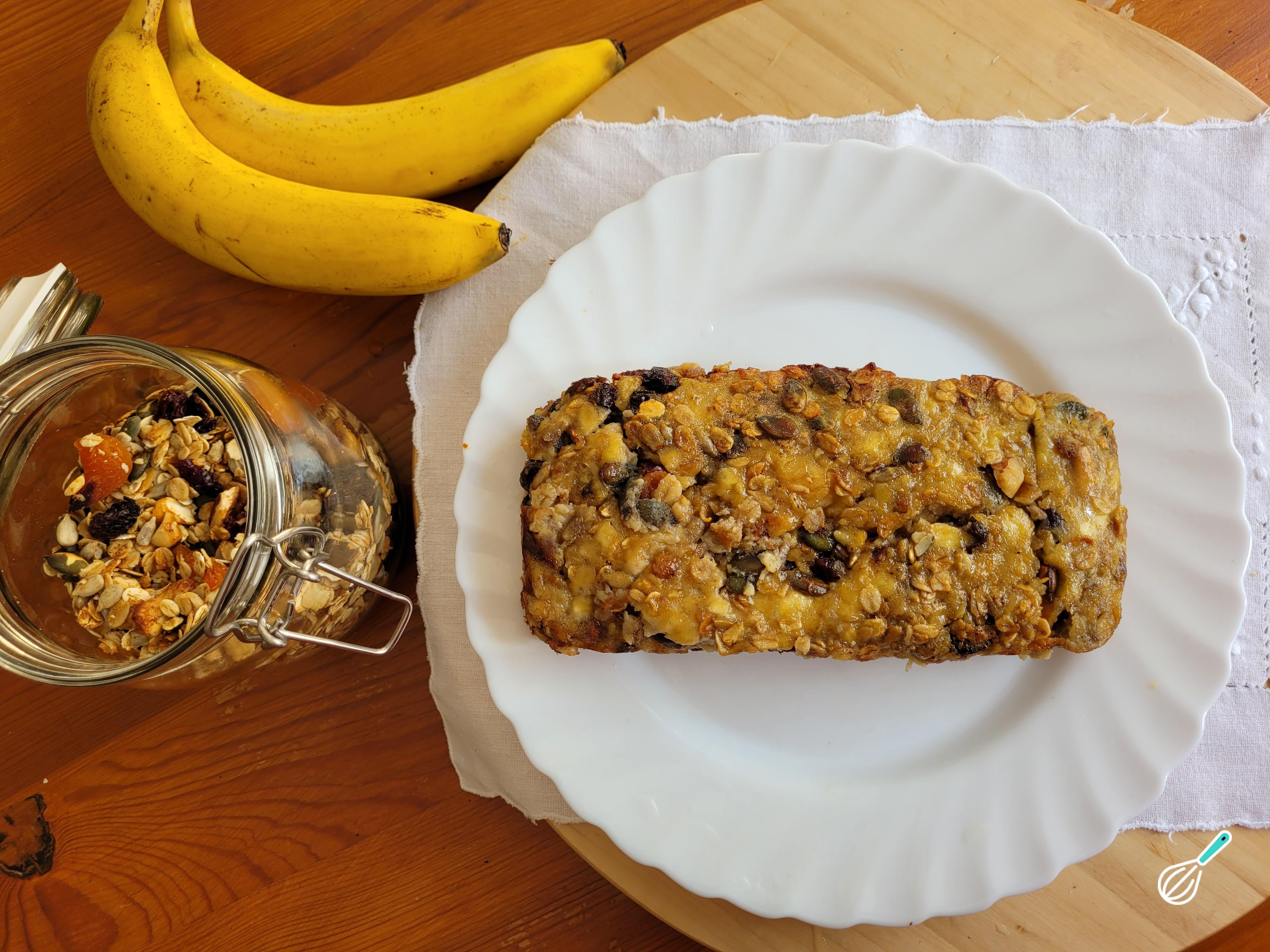 Seu bolo de banana com granola está pronto para ser servido. Fica ótimo com um cafezinho no lanche da tarde!