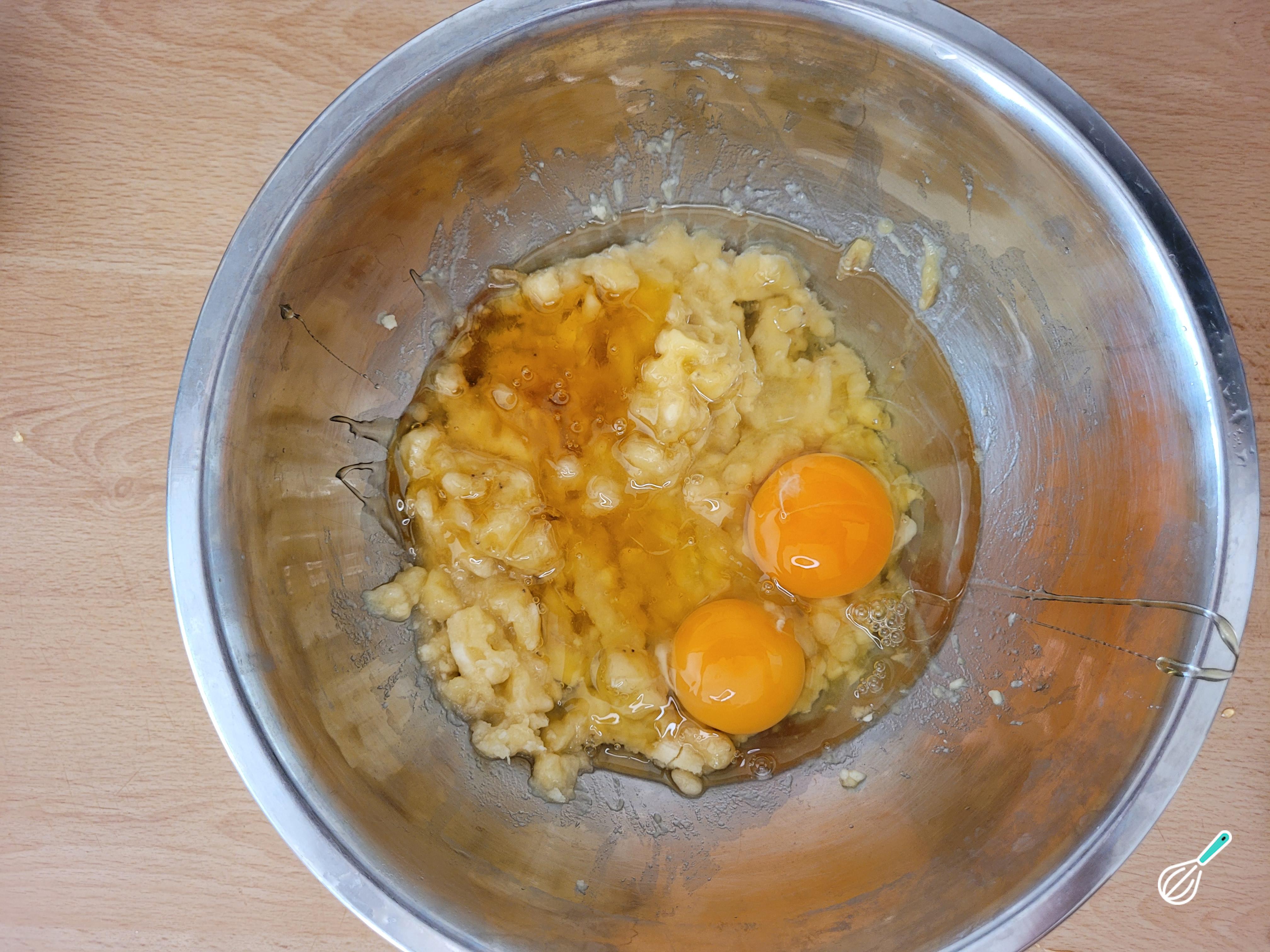 Acrescente os ovos, o mel e o óleo de coco e misture bem.