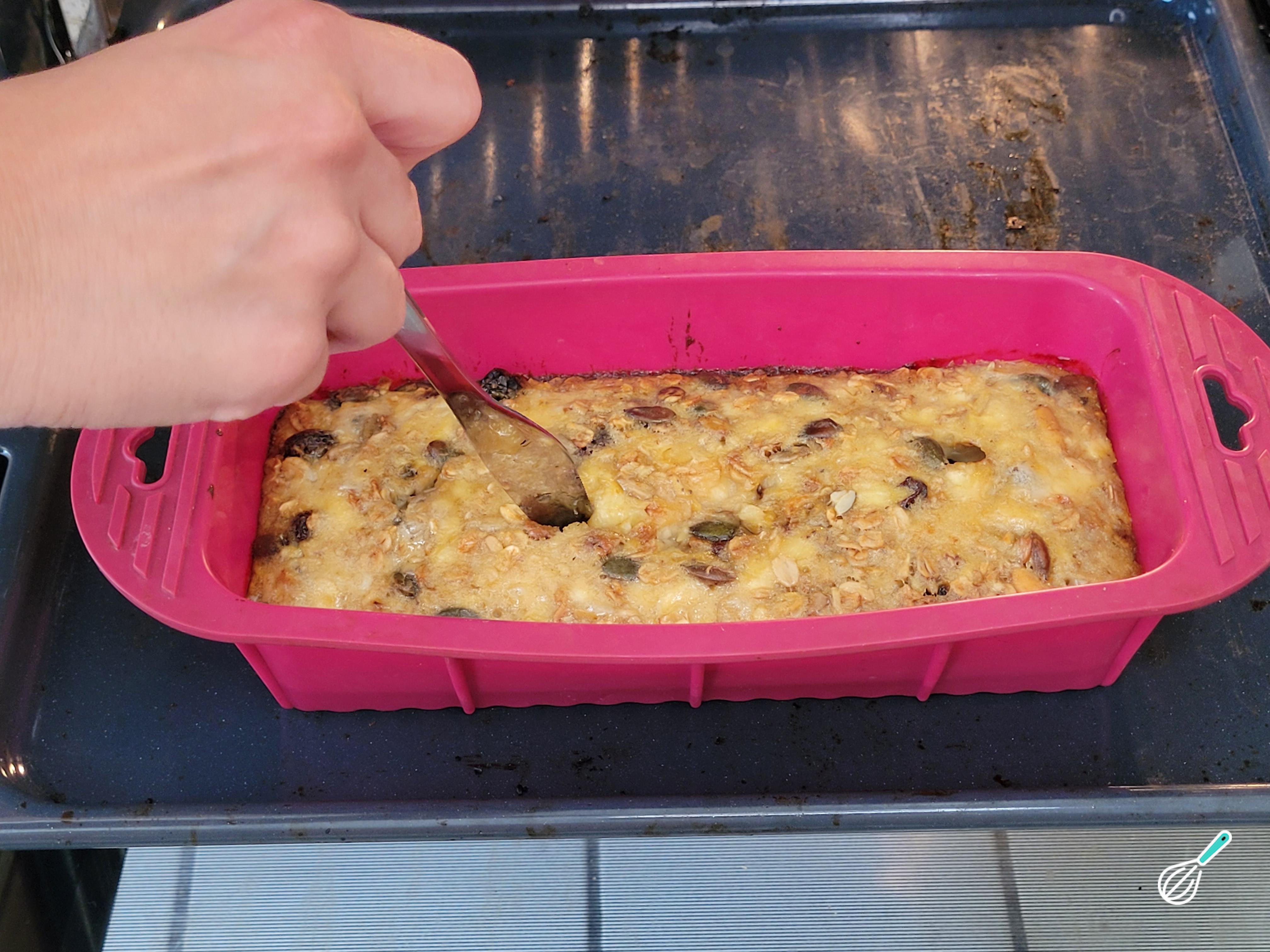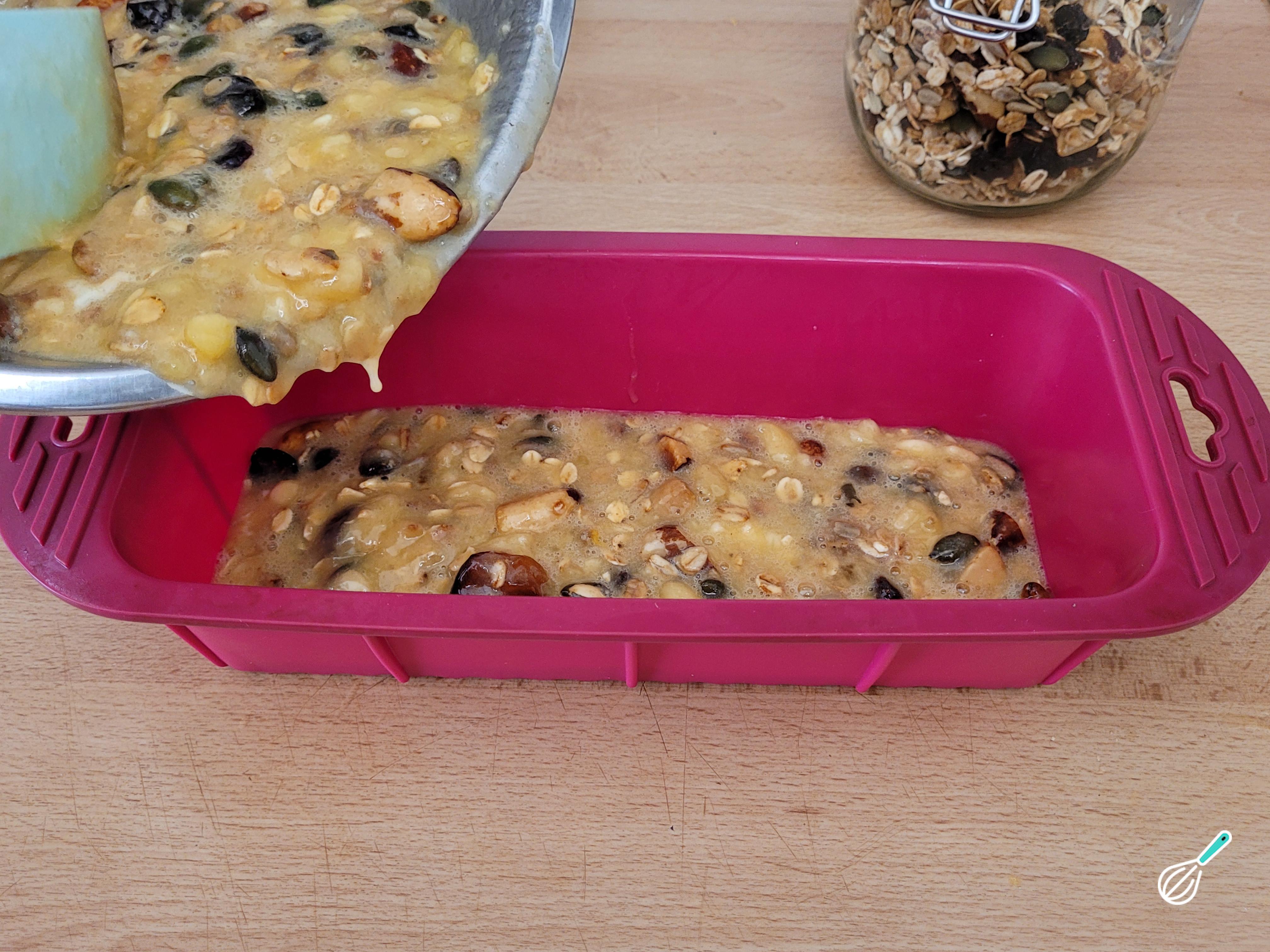 Acrescente a granola e o fermento químico e leve para uma forma untada (a minha era de silicone, então nem precisei untar)