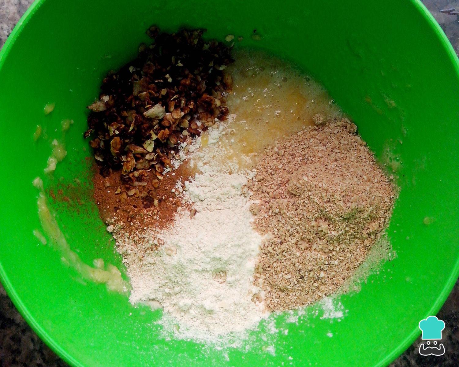 Para fazer este bolo de banana saudável comece por bater no liquidificador as bananas com o ovo e o óleo de coco. Numa tigela misture os restantes ingredientes, menos o fermento, adicione o creme de banana e misture tudo muito bem.