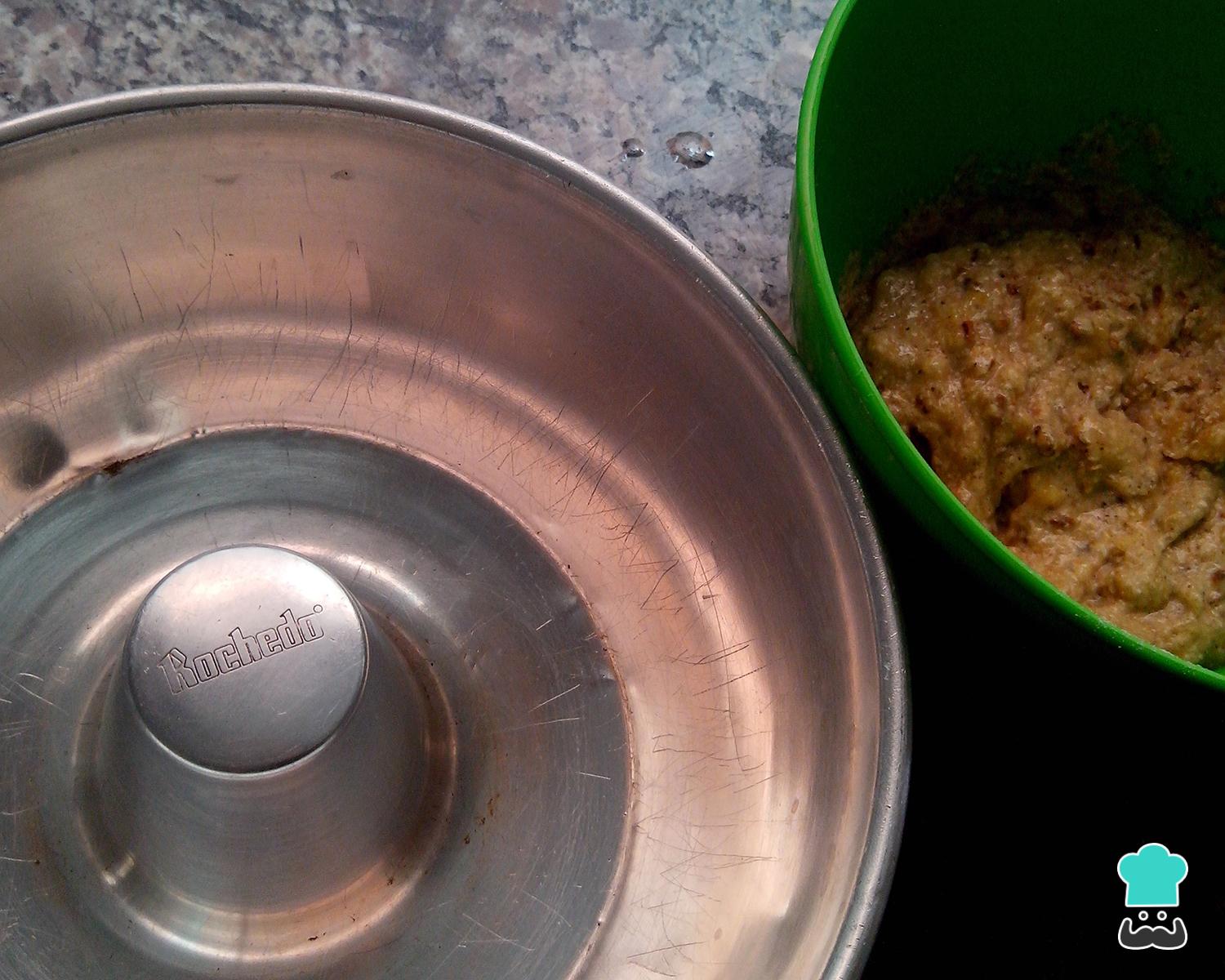 Unte uma forma pequena com azeite, manteiga ou óleo de coco e despeje a massa do bolo de banana nela. Leve para assar em fogo médio até dourar e passar no teste do palito.