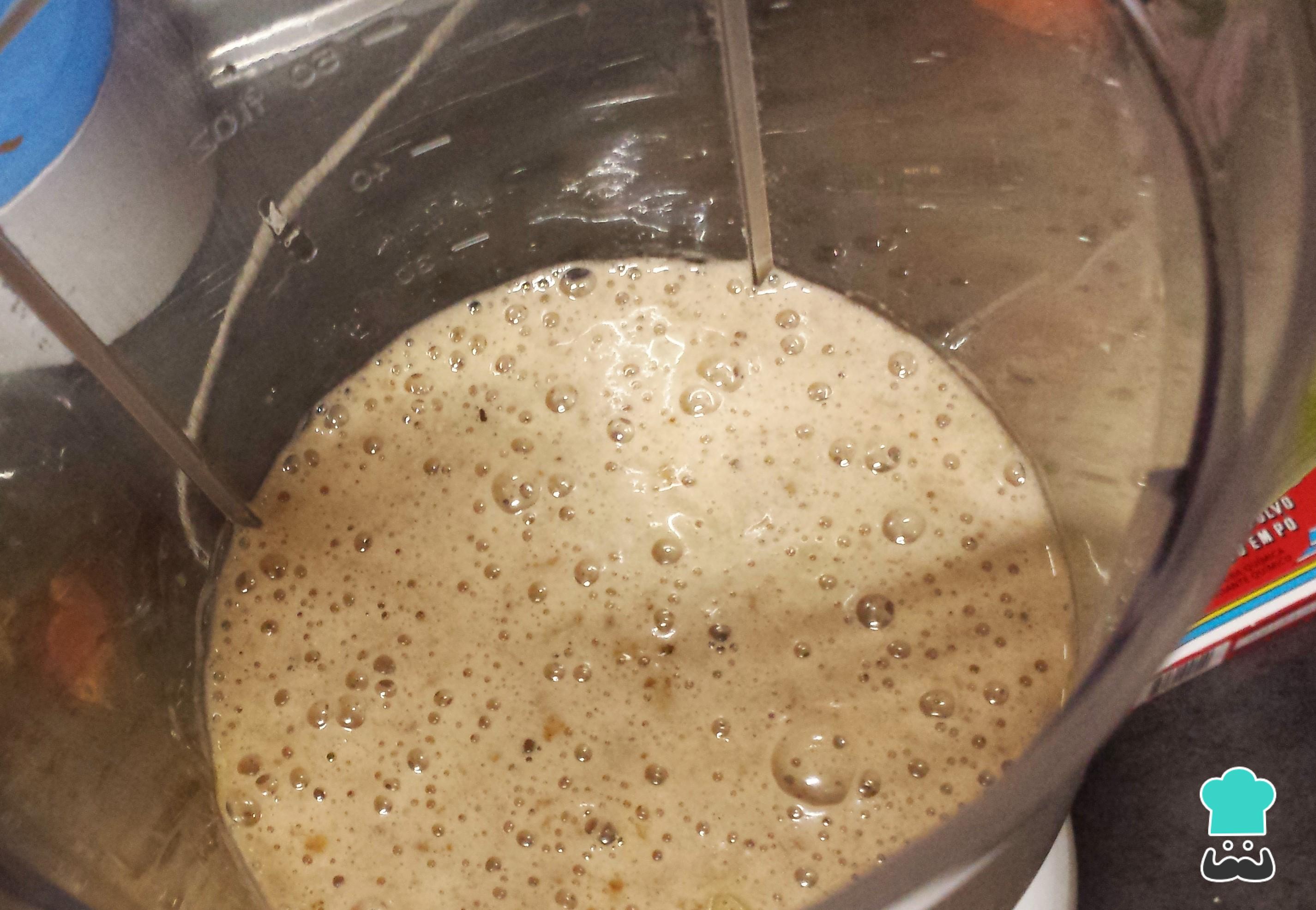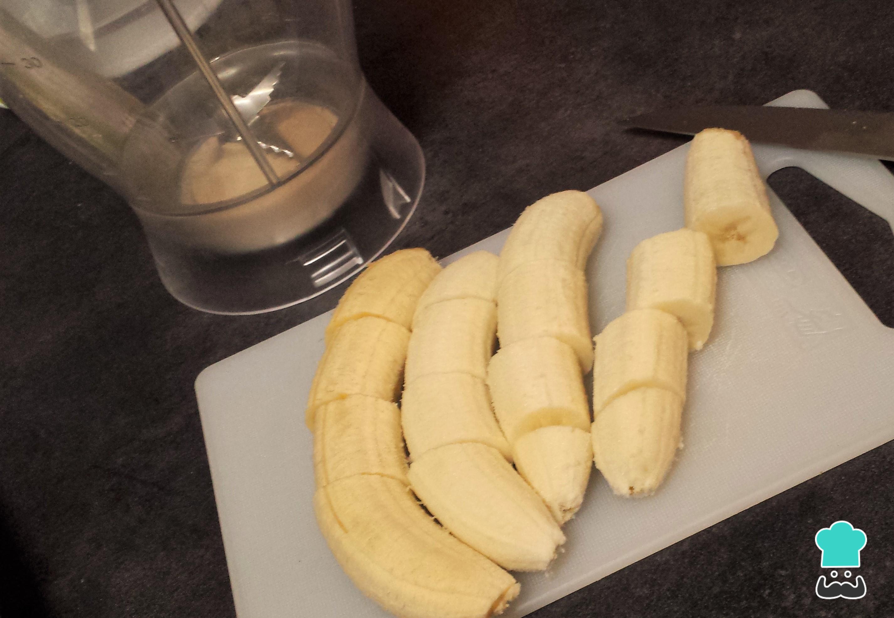 Primeiramente descasque as bananas e corte em pedaços, para facilitar bater a fruta no liquidificador. Se estiver usando bananas muito grandes, duas serão suficientes; se forem muito pequenas, será melhor usar quatro bananas.