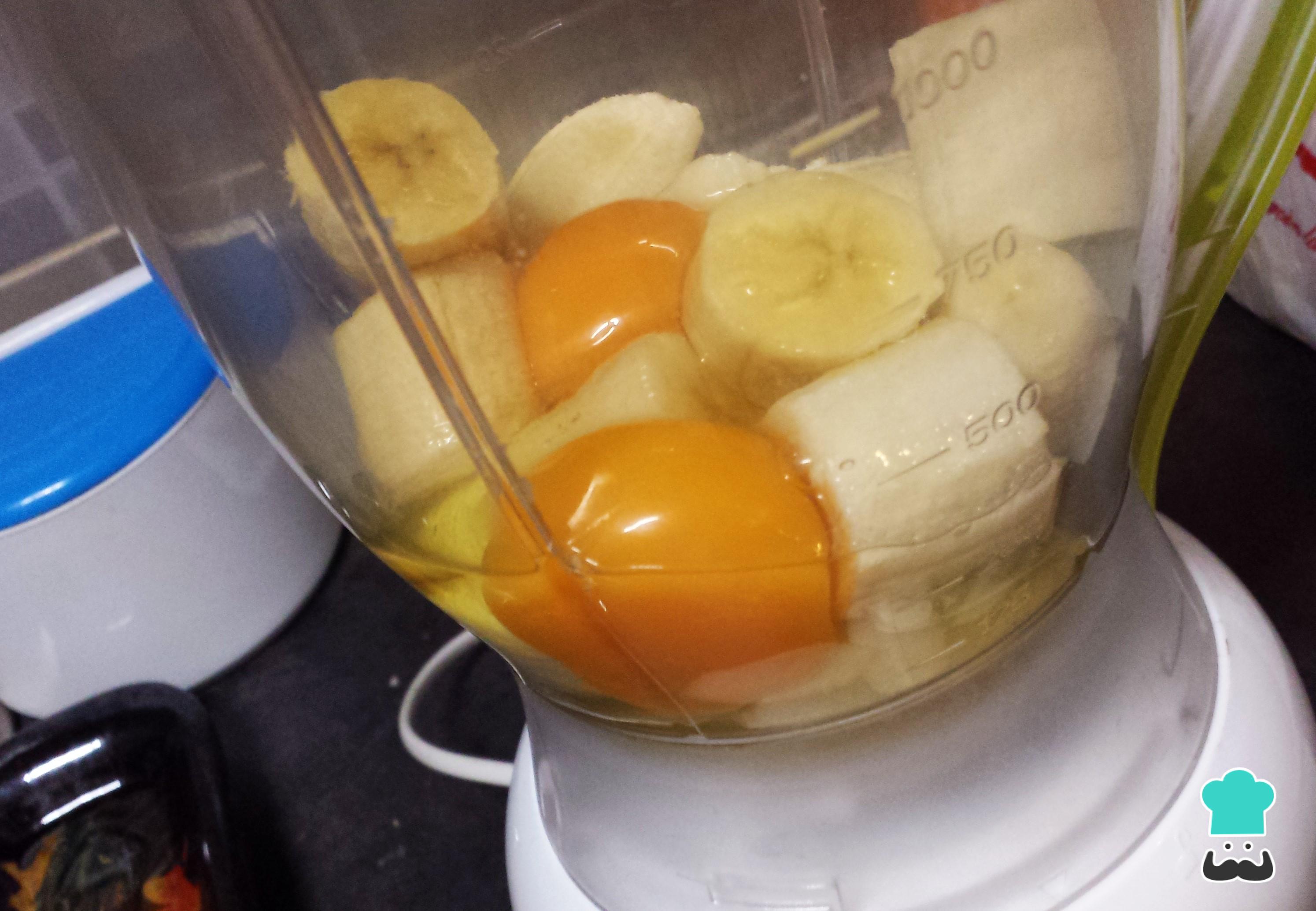 Coloque as bananas e os ovos no liquidificador e bata em potência máxima até obter um purê. Pré-aqueça o forno nos 180ºC.