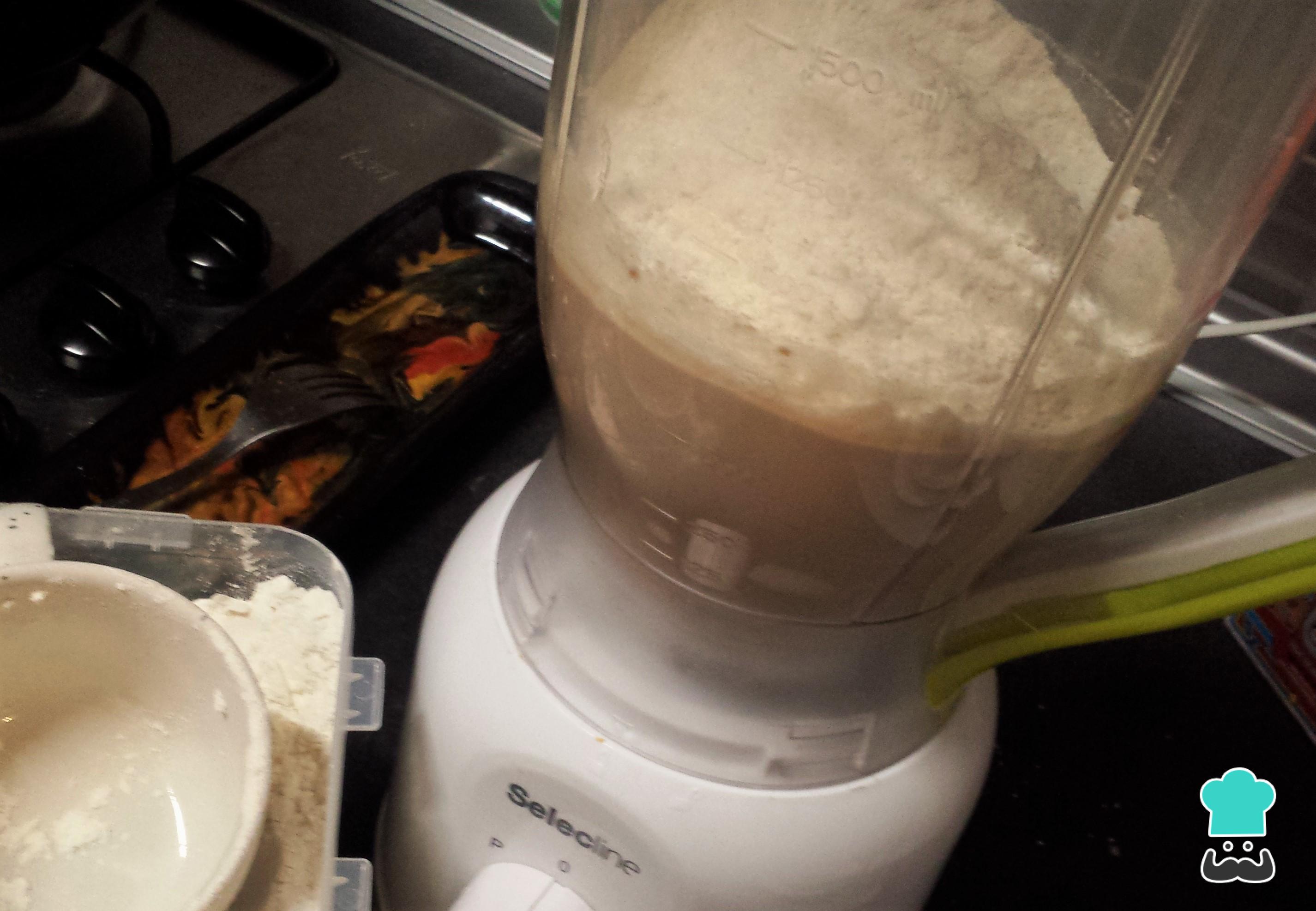 Para terminar o preparo do bolo de banana de liquidificador, adicione a farinha com o sal e o fermento em pó por duas vezes, ou seja, adicione metade e, quando estiver bem integrado, acrescente o restante.