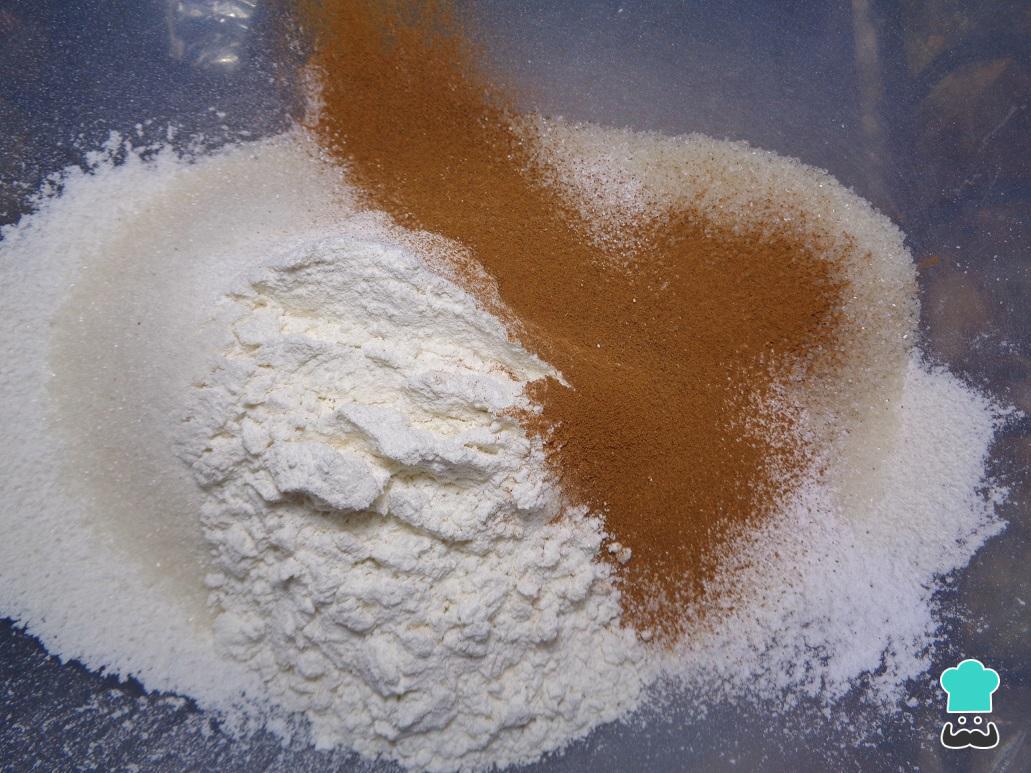 Começamos misturando os ingredientes secos. Para isso coloque o açúcar numa tigela e peneire o trigo, a canela, o fermento e o bicarbonato de sódio. Reserve.