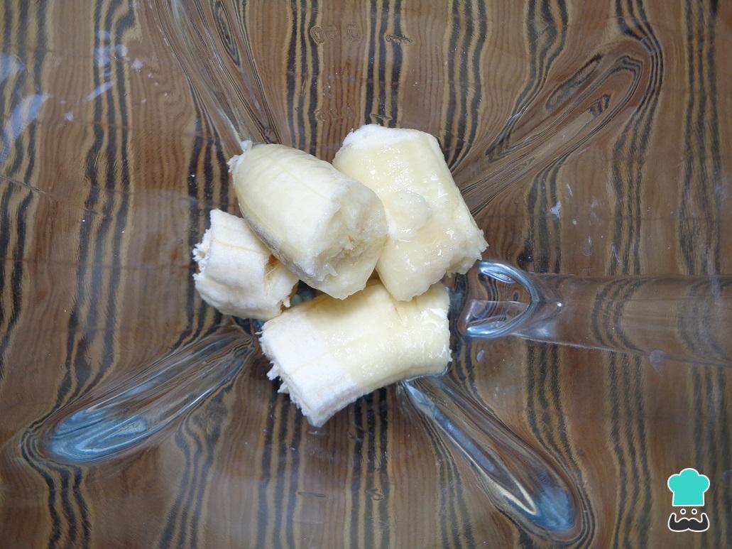 No liquidificador coloque as bananas descascadas e quebradas em pedaços, o óleo e o leite, que poderá ser o comum leite de vaca ou, se você segue uma alimentação vegetariana ou vegana, será leite vegetal como o leite de soja, por exemplo. Bata até virar um creme lisinho.