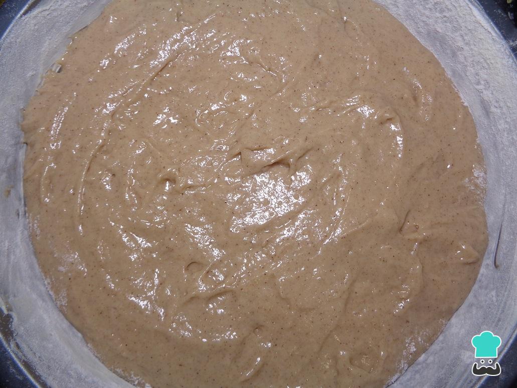 Misture os ingredientes do liquidificador com os ingredientes secos até ficar tudo muito bem incorporado. Unte e enfarinhe uma forma de bolo de 22-24 cm e coloque nela a massa deste bolo de banana sem ovo.