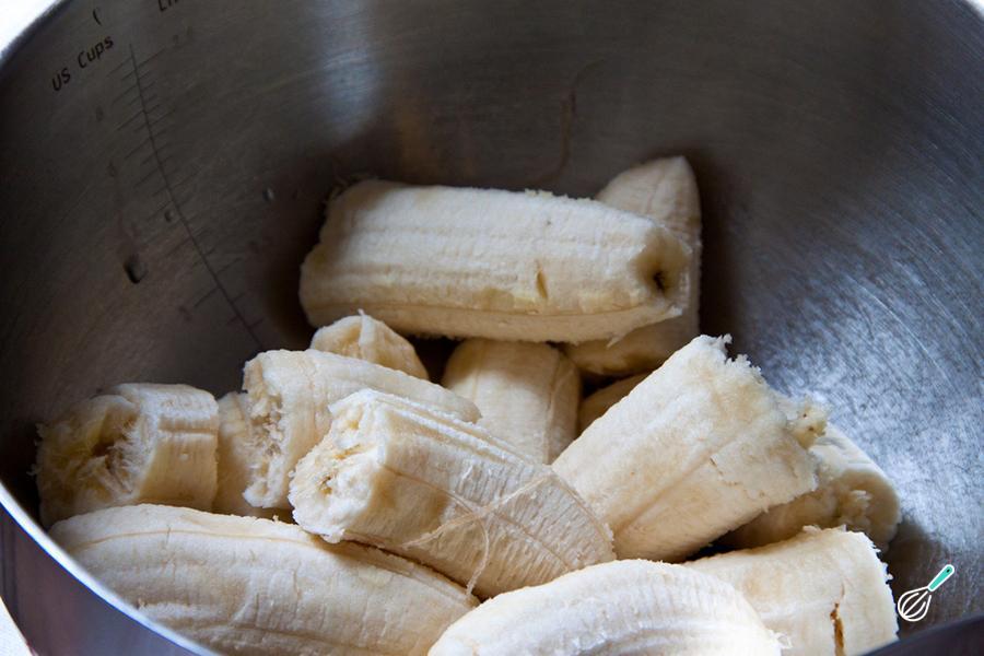 Separadamente, amasse as bananas até formar um purê. Em seguida, despeje este purê no recipiente onde você tem a mistura de açúcar e manteiga e bata tudo.