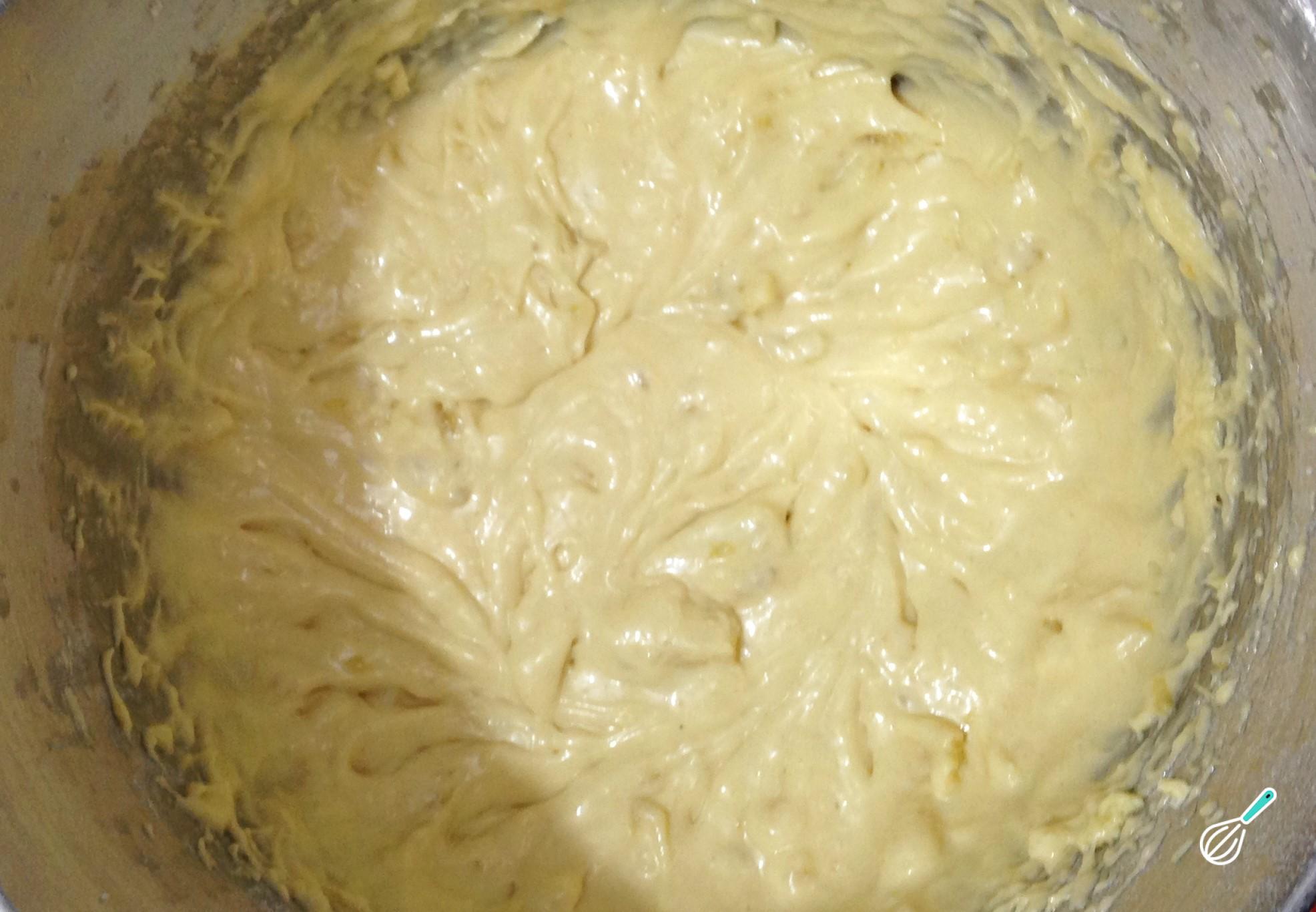 Em seguida, incorpore a farinha pouco a pouco na massa de bolo de banana, mexendo sempre. Uma vez integrada, adicione o fermento em pó, a essência de baunilha e os ovos e continue batendo até que o resultado seja uma massa cremosa e macia.