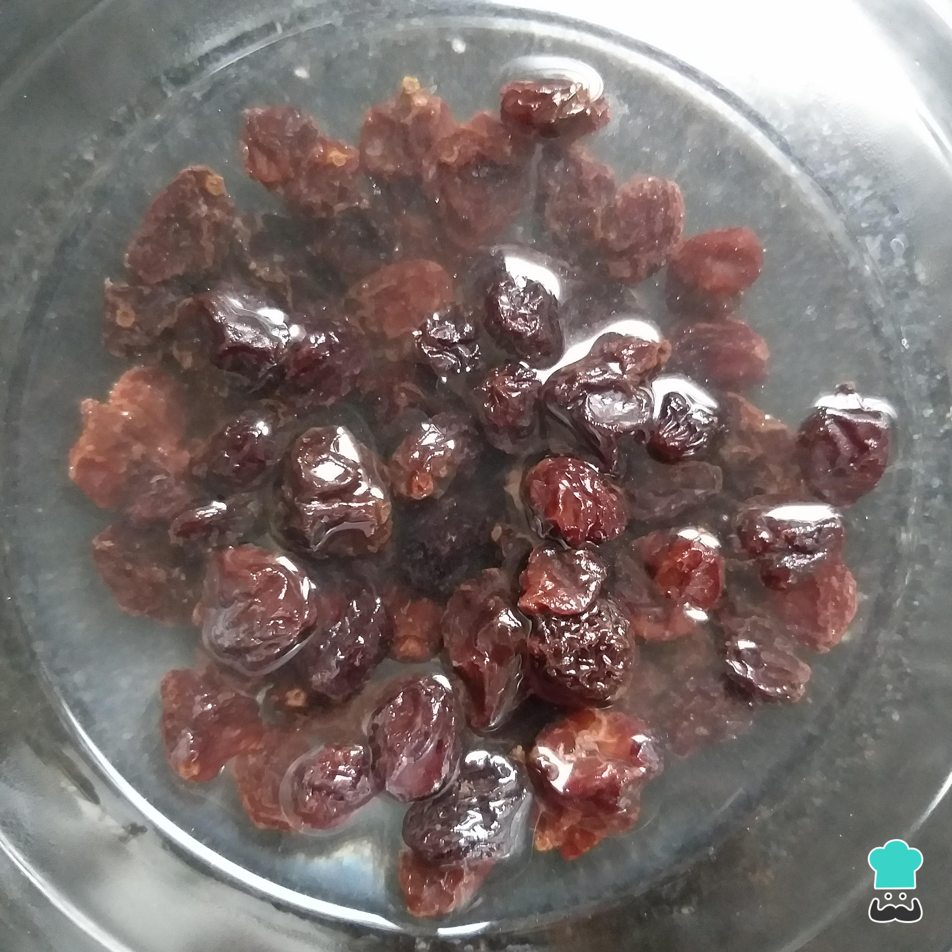 Misture as uvas passas com a água e deixe descansar por 30 minutos, para que as uvas passas hidratem e fiquem mais macias.