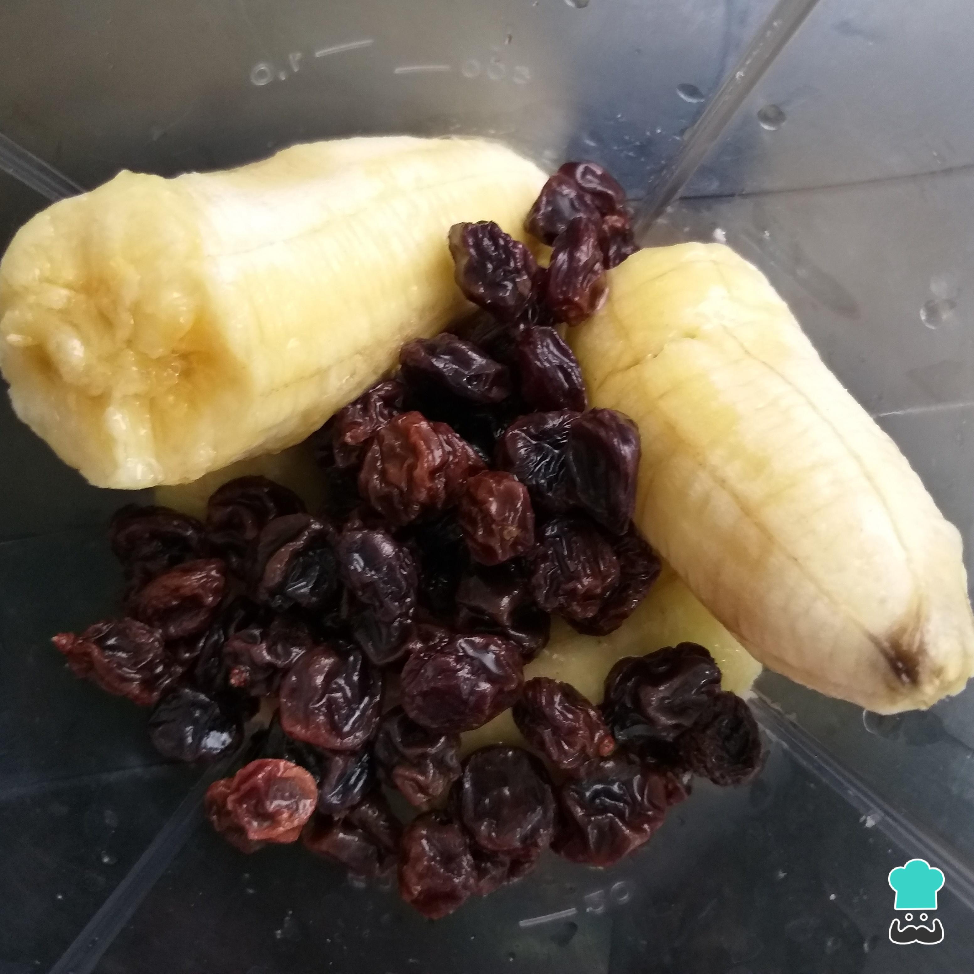 Após esse tempo coloque no liquidificador as bananas descascadas, o ovo, o óleo, a água e as uvas passas. Bata bem, até obter uma misturinha homogênea.