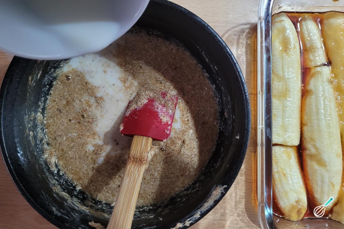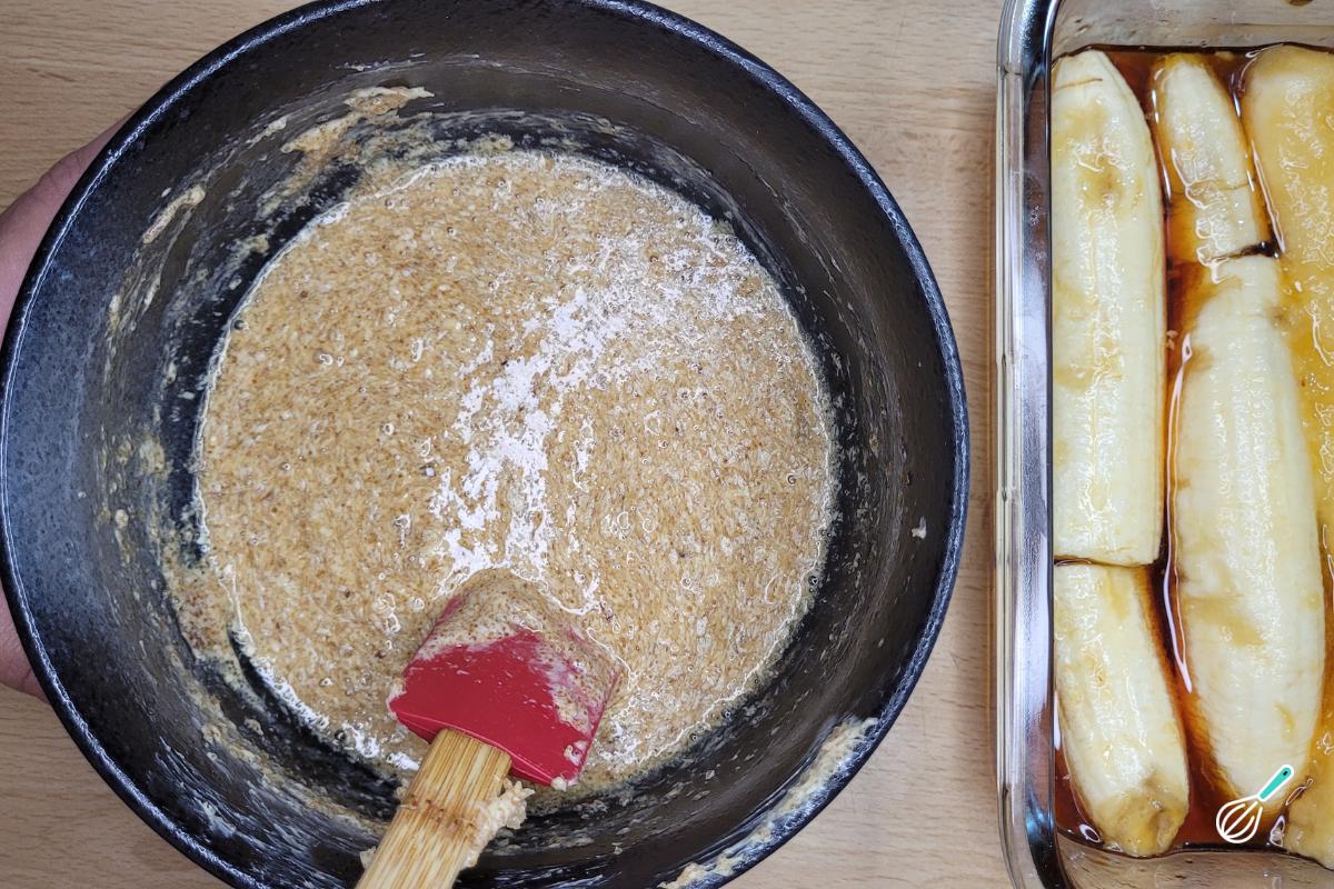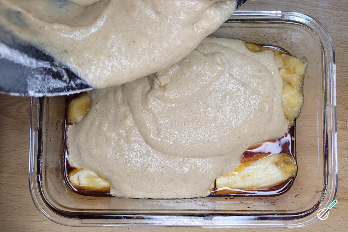 Disponha as bananas no fundo da forma sobre o caramelo como quiser. Como usei uma forma retangular, coloquei uma ao lado da outra. Gosto de colocar com o lado das sementes virado para baixo para ficar mais uniforme ao desenformar o bolo, mas pode colocar da outra maneira se preferir.