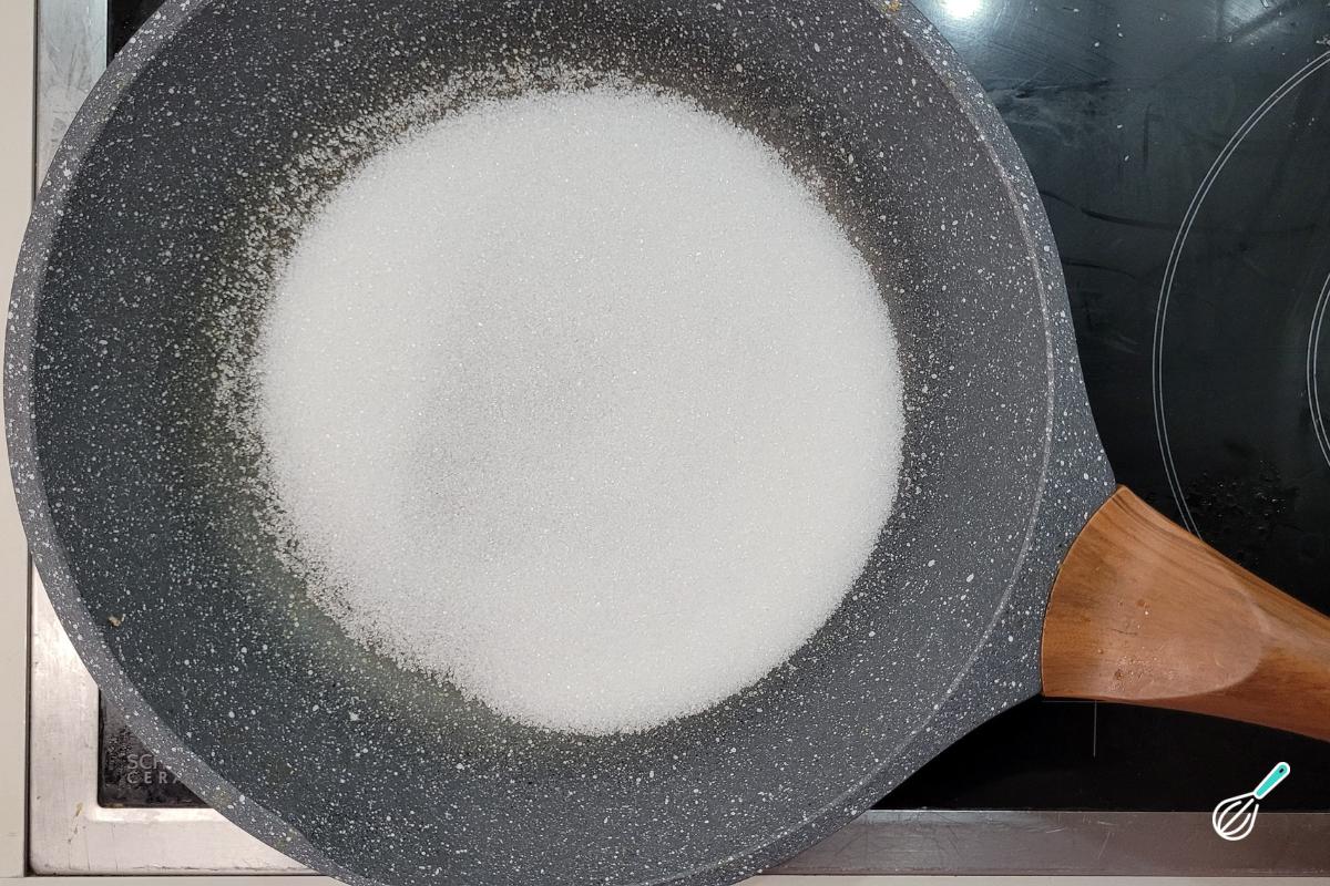 Espalhe o açúcar sobre toda a base de uma frigideira com o fogo desligado. Ligue o fogo e deixe o açúcar derreter, sem mexer com colher ou espátula porque isso altera a cristalização do açúcar e pode desandar o caramelo. Tome cuidado para não queimar. Se necessário, gire um pouco a frigideira.