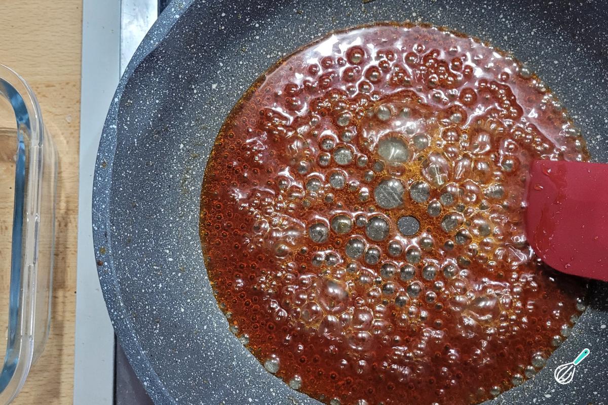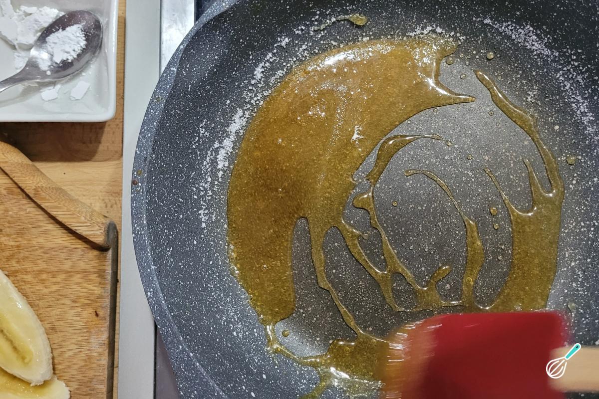Quando estiver no ponto de caramelo, espalhe no fundo da forma onde irá assar o bolo.