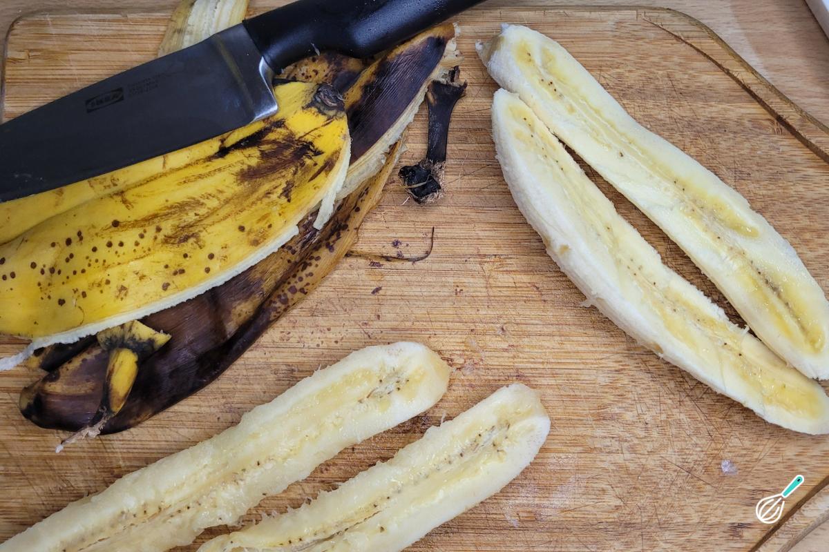 Descasque a corte as bananas ao meio. Quanto mais maduras estiverem as bananas, melhor para fazer o bolo porque elas ficam mais docinhas, sem necessidade de colocar tanto açúcar.