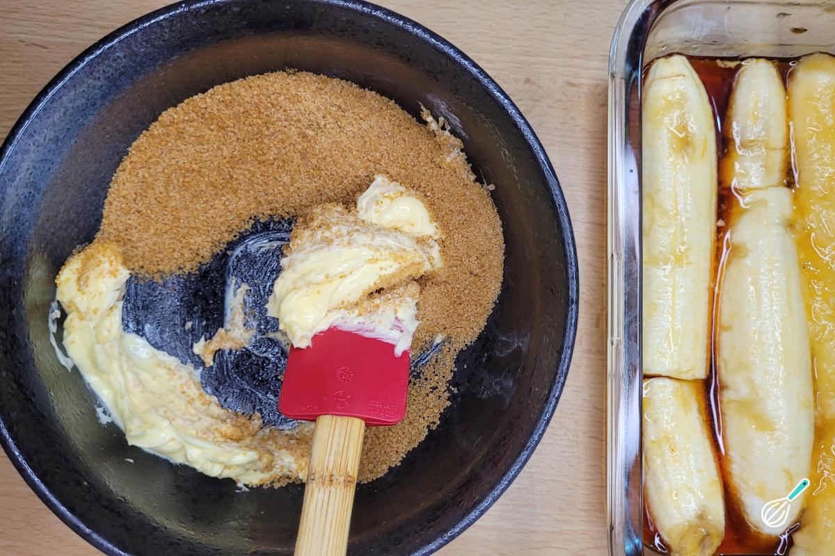 Comece misturando a manteiga com o açúcar mascavo. É importante que a manteiga esteja amolecida em ponto pomada para ficar mais fácil de misturar.
