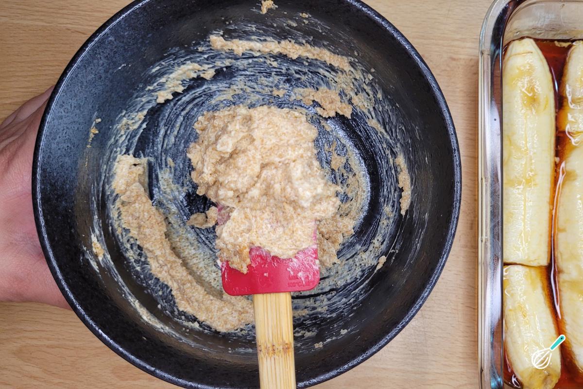 Bata bem até formar uma pastinha. Se preferir, use um batedor de arame, mas quando a manteiga está bem amolecida, uma espátula já funciona e facilita na hora de misturar os próximos ingredientes, porque a pastinha tende a ficar grudada entre os arames do batedor.