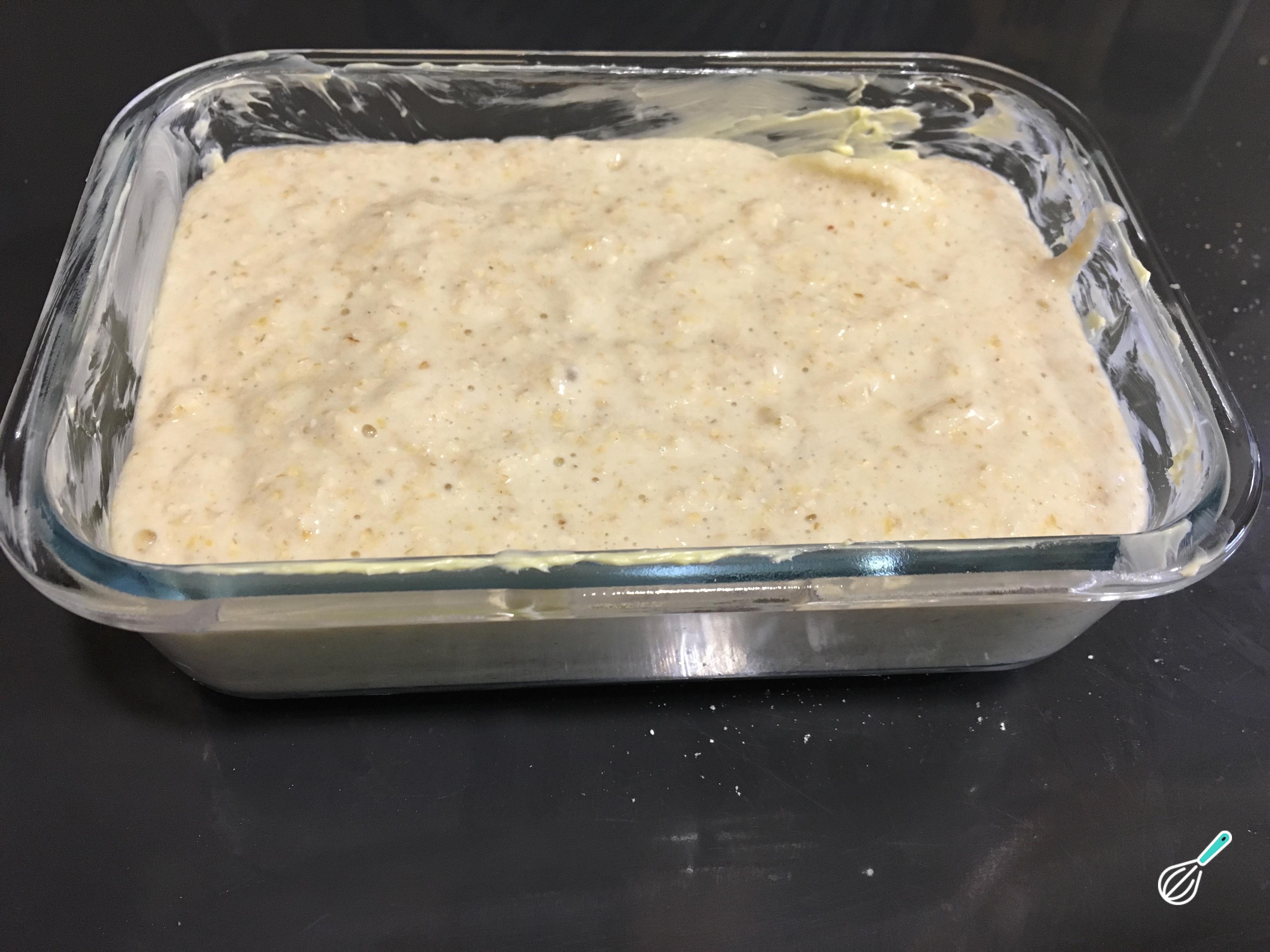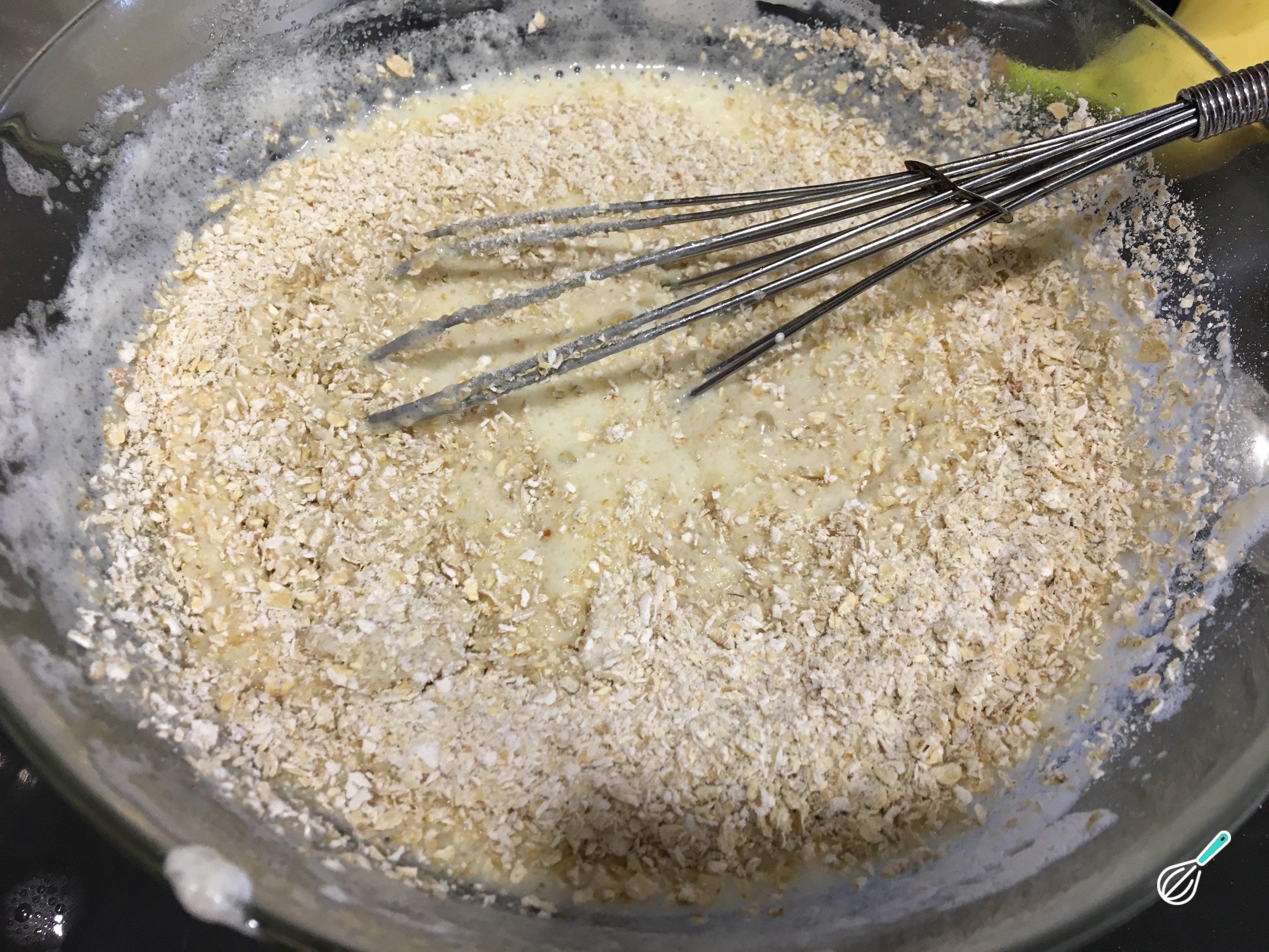 Junte a farinha de aveia com o fermento em pó e o adoçante. Misture bem com um batedor manual até integrar todos os ingredientes