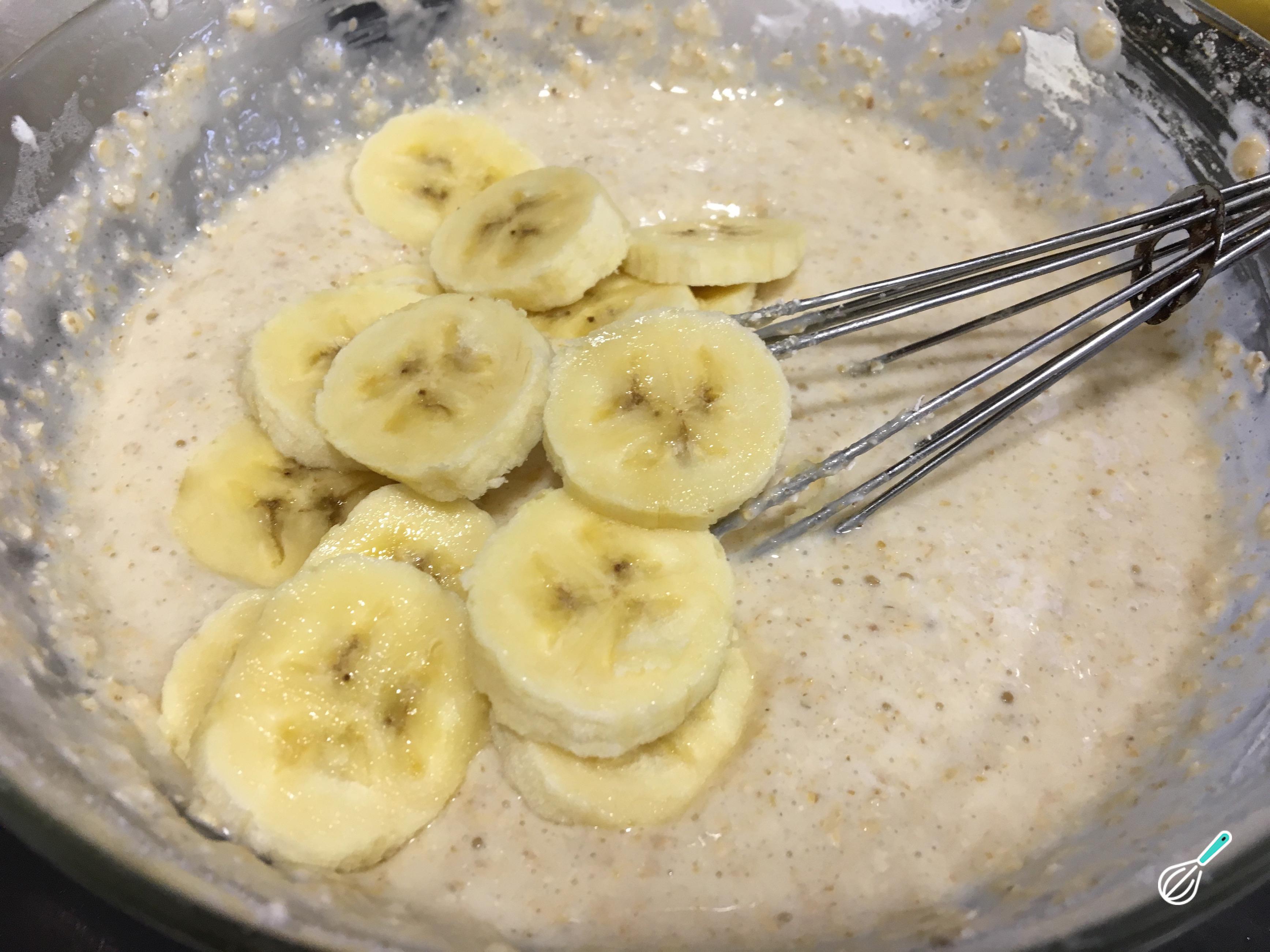 Adicione as rodelas de banana e misture com cuidado para evitar esmagá-las. Para preparar este bolo de banana light de microondas, você também pode usar outras frutas que você goste.