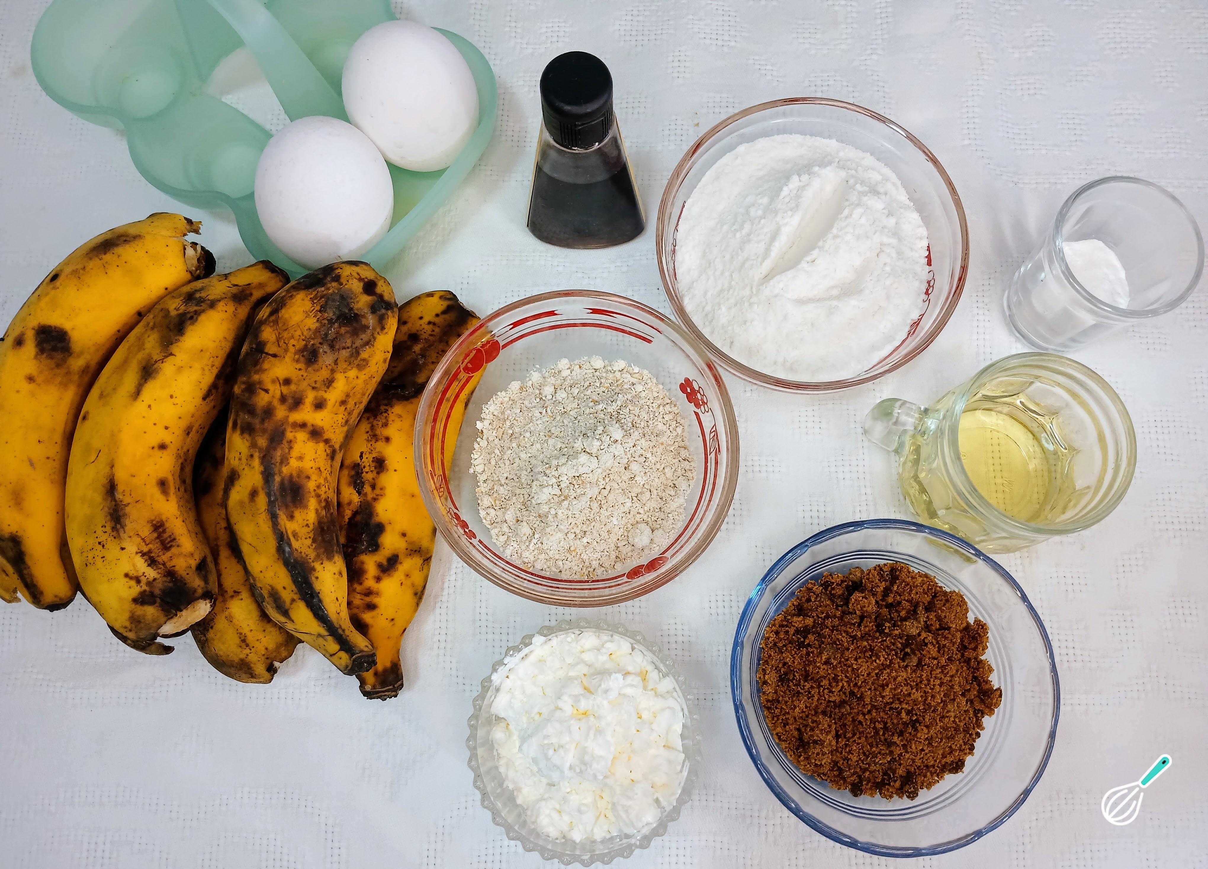 Comece separando os ingredientes para o preparo do bolo de banana sem glúten e sem lactose. Separe as farinhas de arroz e de aveia. Separe o amido de milho e também as bananas prata maduras. Separe a essência de baunilha, o açúcar mascavo e os ovos. Separe o óleo de girassol.