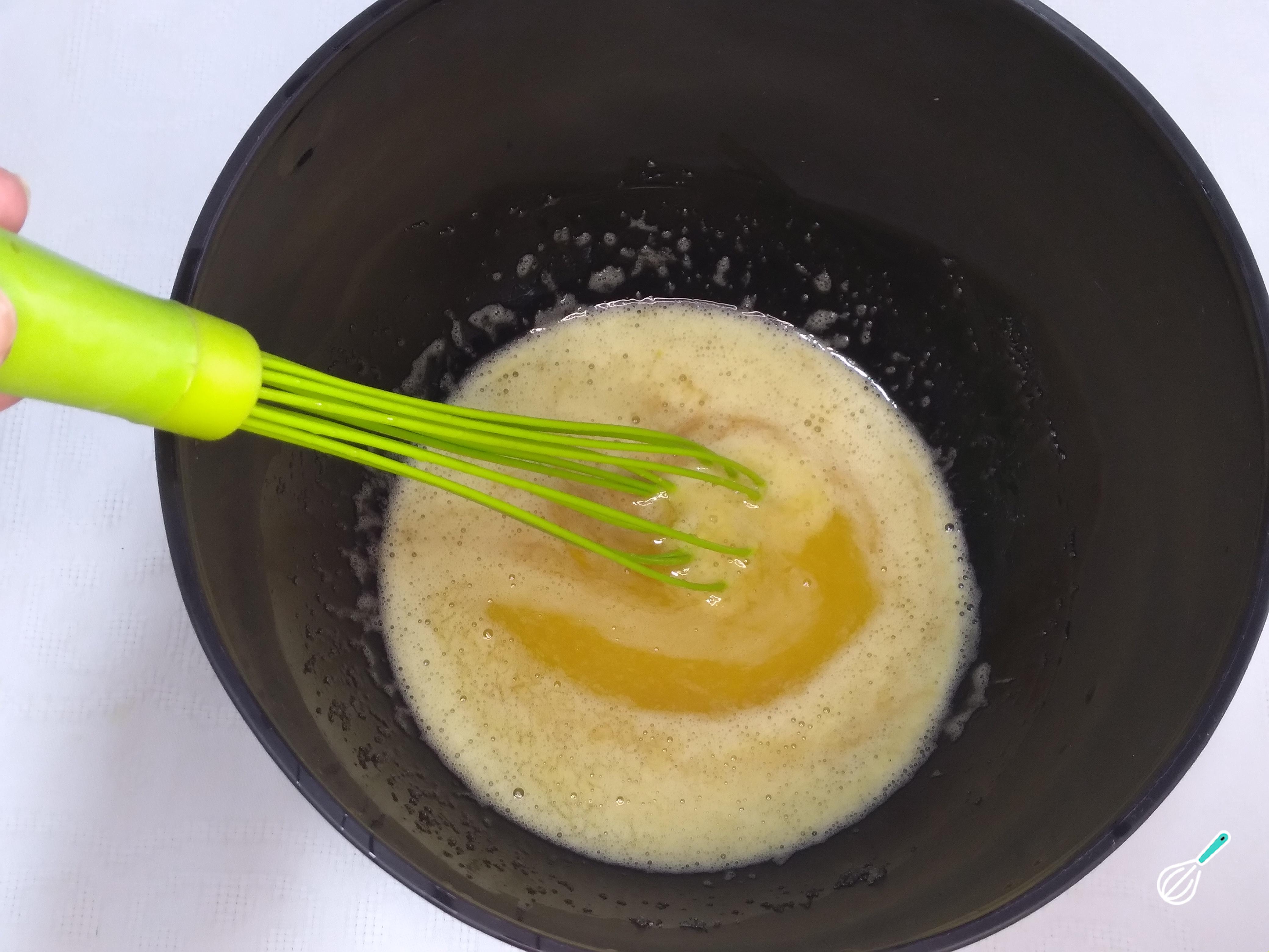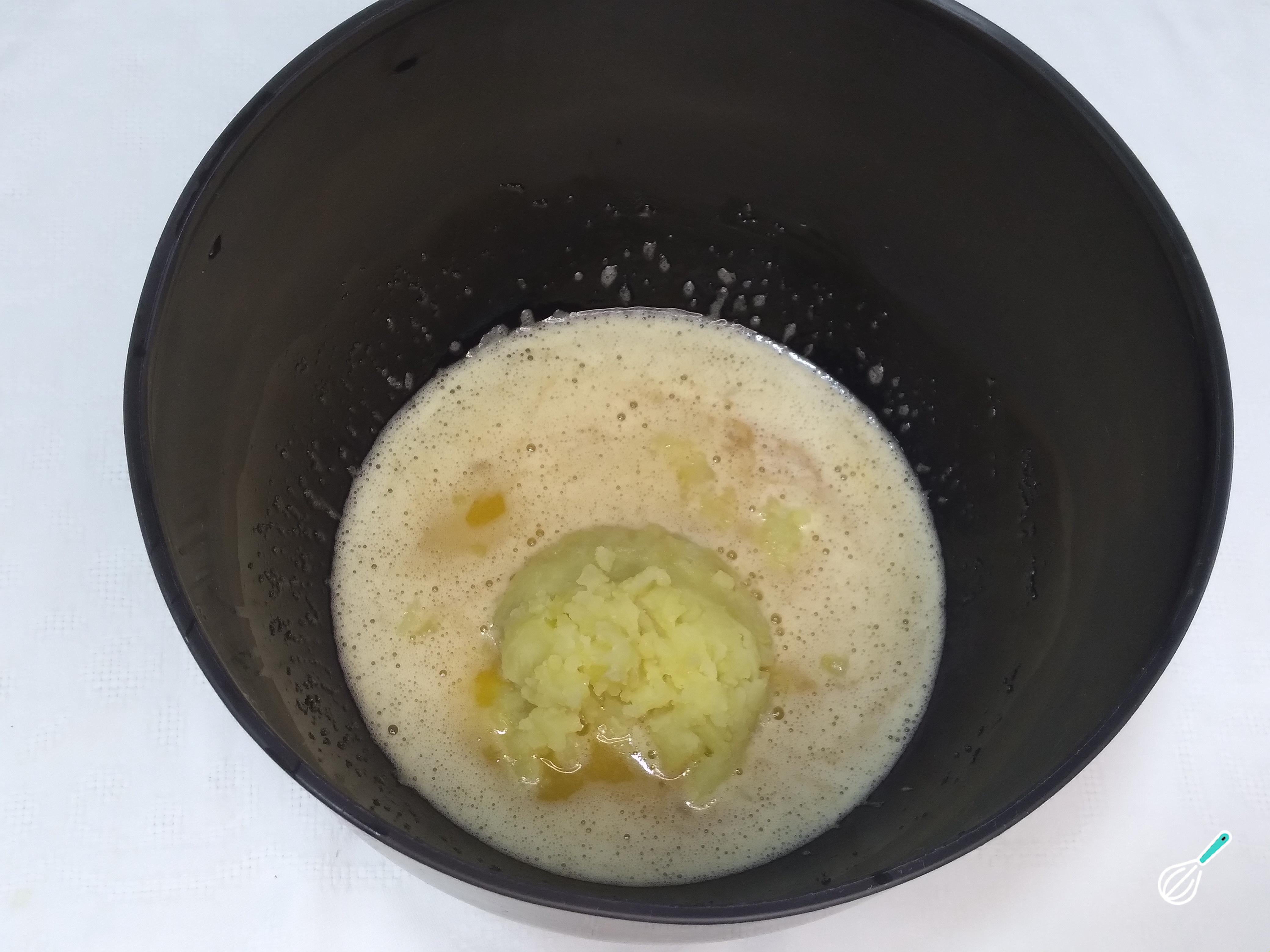Em seguida, acrescente a batata doce e mexa novamente com o fouet até que a batata esteja bem incorporada.