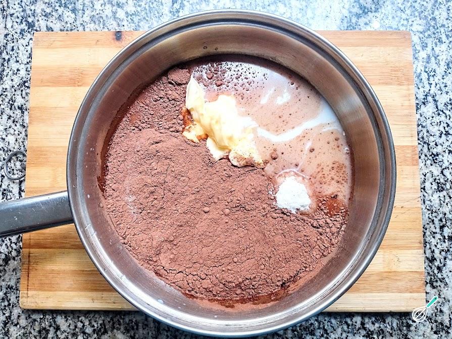12. Em uma panela coloque o leite, chocolate em pó e a manteiga. Mexa para misturar os ingredientes. Não precisa ficar mexendo sempre. Só preste atenção, pois quando atingir ponto de fervura, a calda irá subir e pode derramar. O processo deve ser feito em fogo baixo.